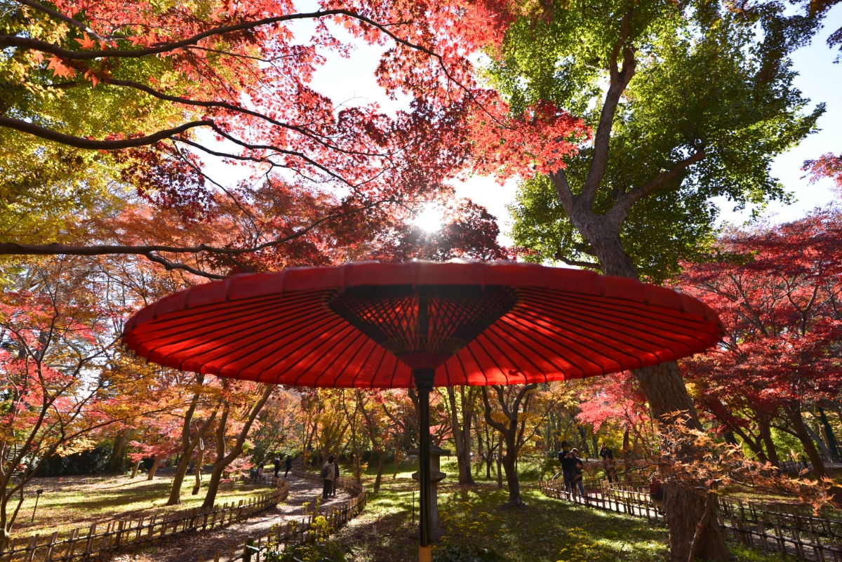 カエデ園での紅葉です。 12月になると赤く染まり、紅葉シーズンに限り、設置している大きな和傘と一緒に撮影が出来ます。 2024年12月7日(土)撮影