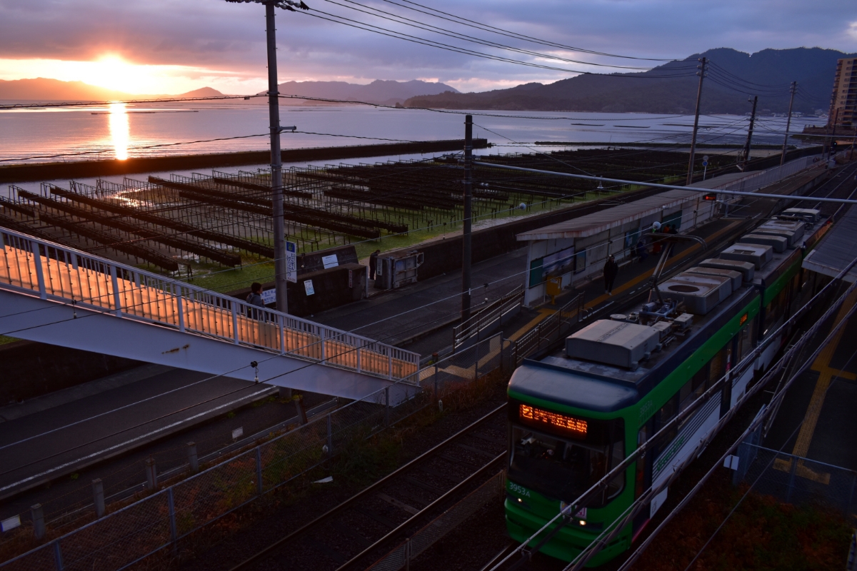 朝焼け、神社、そしてひろでん