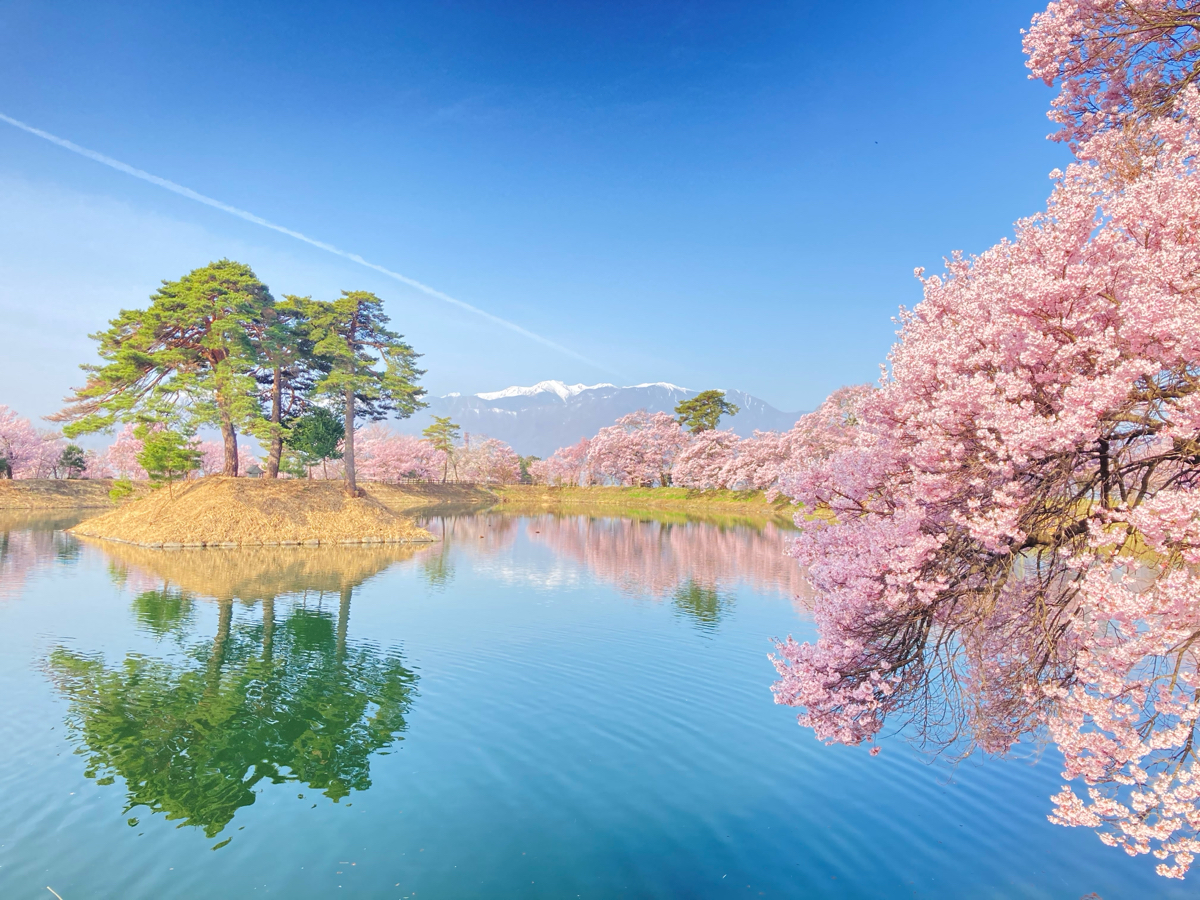 《六道の堤》 池にタカトオコヒガンザクラと残雪のアルプスが映り、美しい景色が見られます。 タカトオコヒガンザクラはピンクの強い桜で、青空や残雪のアルプスにきれいに映えます。小島も良い雰囲気です。 桜は池の周囲に植えられており、ぐるりと遊歩道があります。広くはないですが、気持ち良く散歩ができます。 立地的に、高遠城址公園でのお花見ついでのお立ち寄りがおすすめです。 撮影時間: 朝がおすすめ! アクセス: 伊那市駅から JRバス関東 高遠駅/高遠高校前行 「上大島」下車+徒歩15分 (駐車場は数台しかないです) ※高台にあるので、徒歩や自転車の方は頑張ってください!