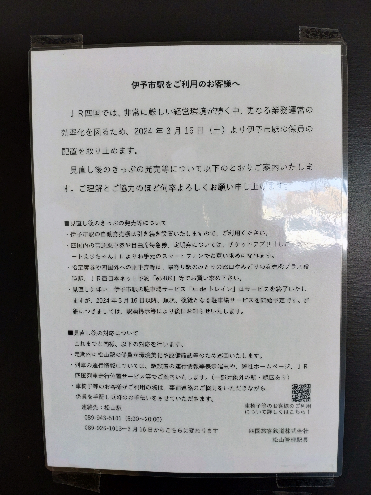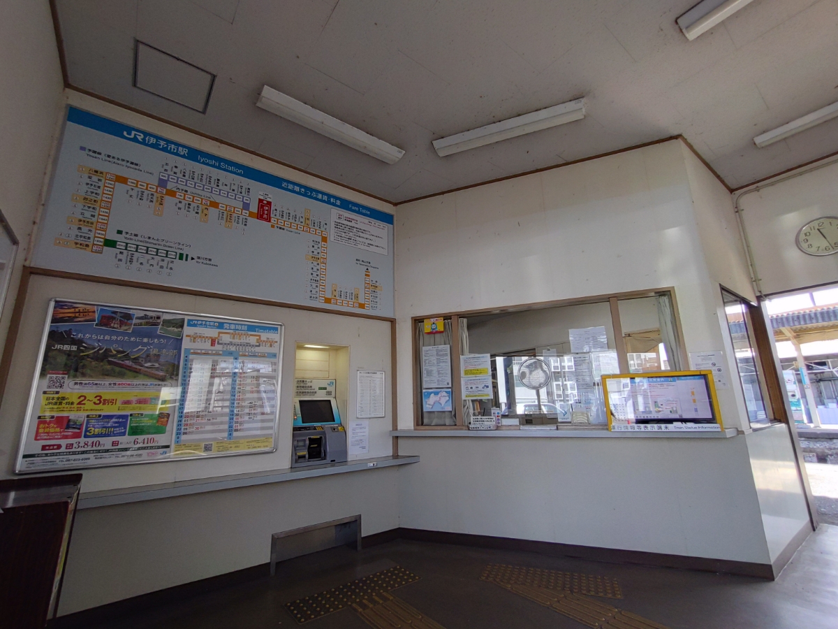この駅のきっぷ売場(駅員さんが切符を発売する窓口)は、2024年3月15日をもって営業終了となり、翌3月16日以降は無人駅になります。 近距離の切符は 引き続き自動券売機で買えますが、指定席券や長距離の切符の購入は、松山駅まで足を運ぶことになります。