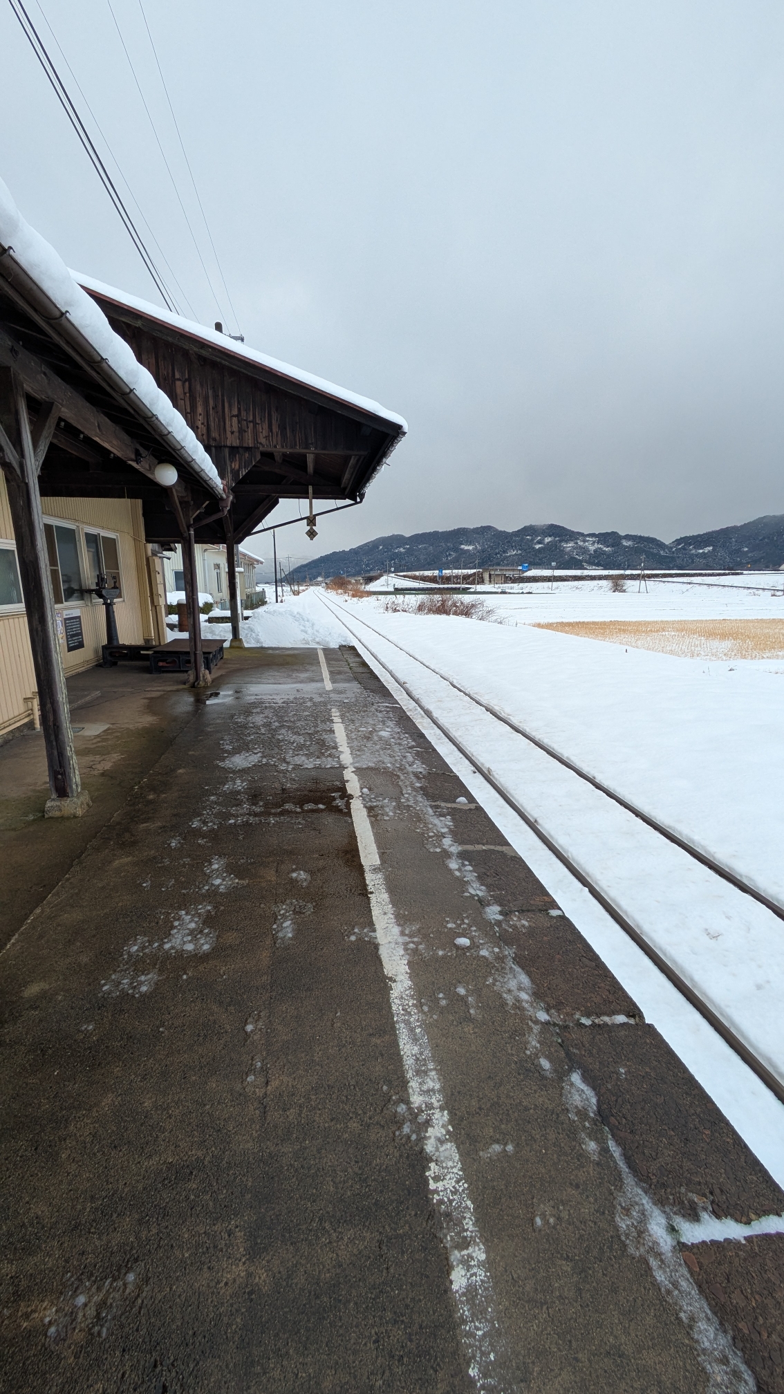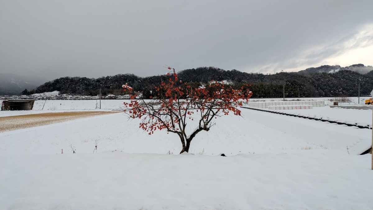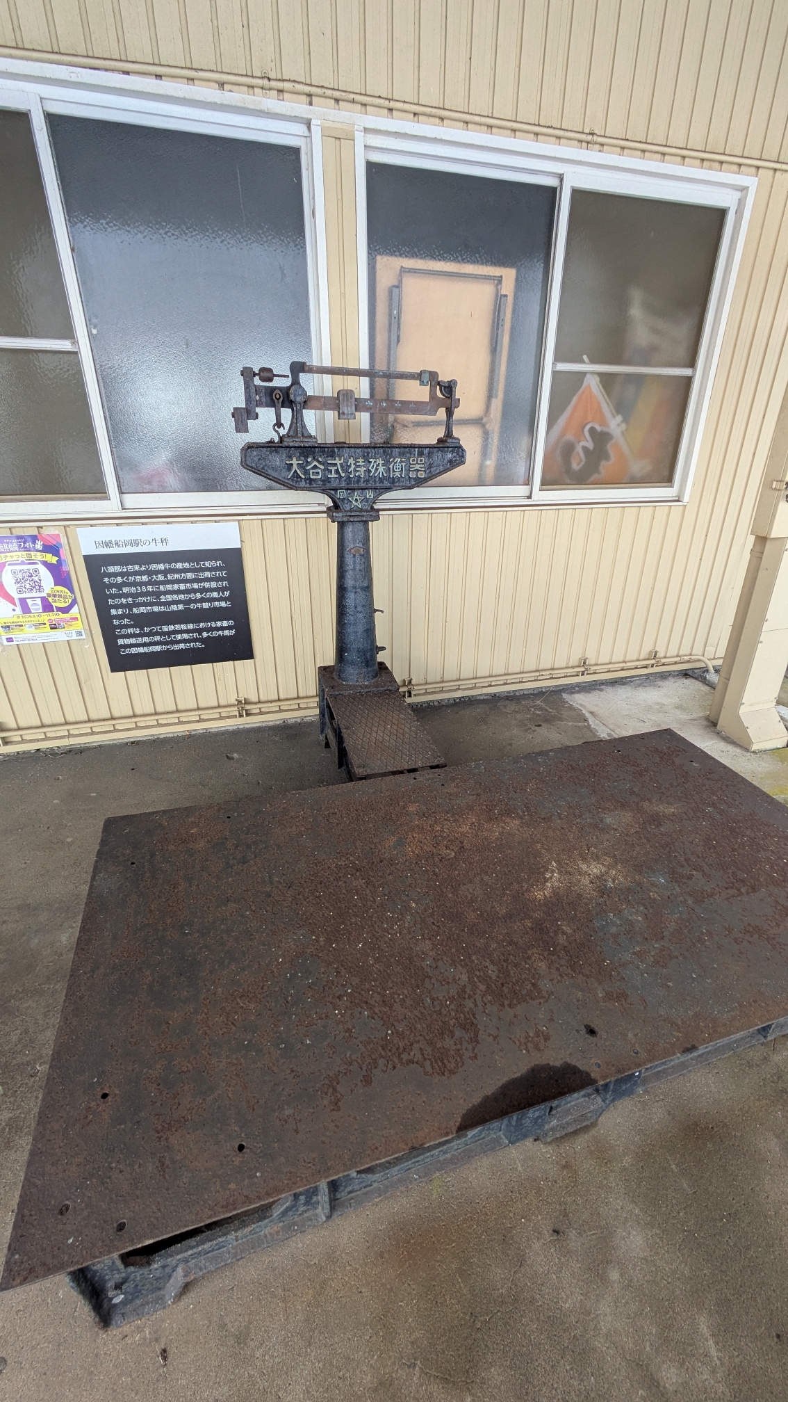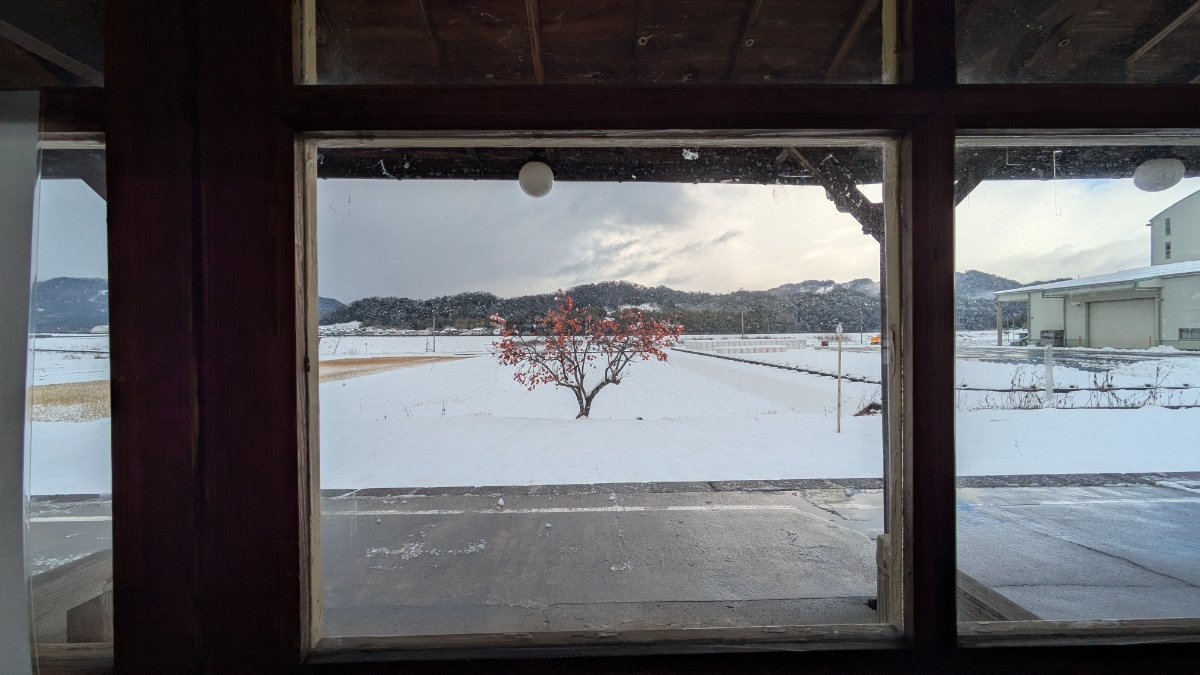 ホームへ出る扉の窓ガラスを覗くと、白い雪景色に1つ、柿の木があるのがとても魅力的で幻想的。 また、牛の体重を測る機械があった