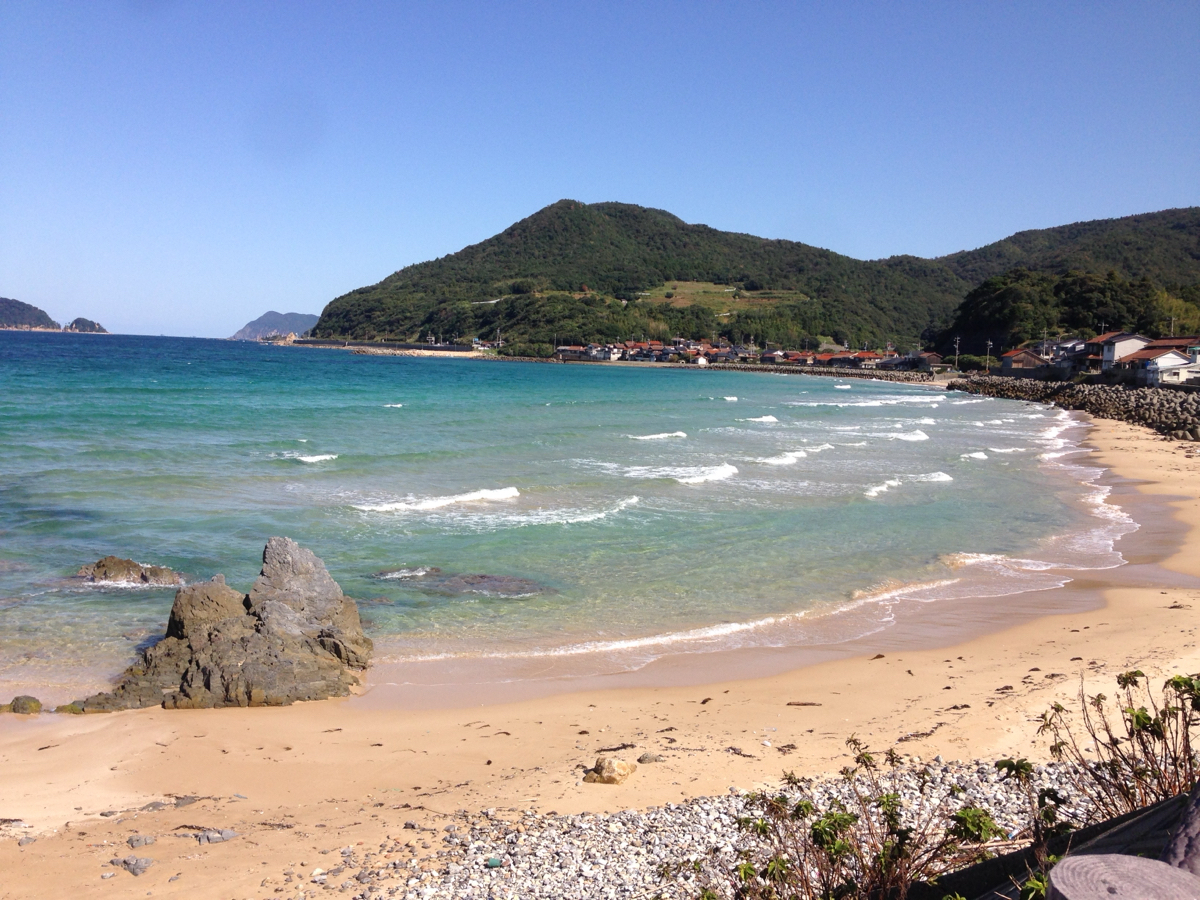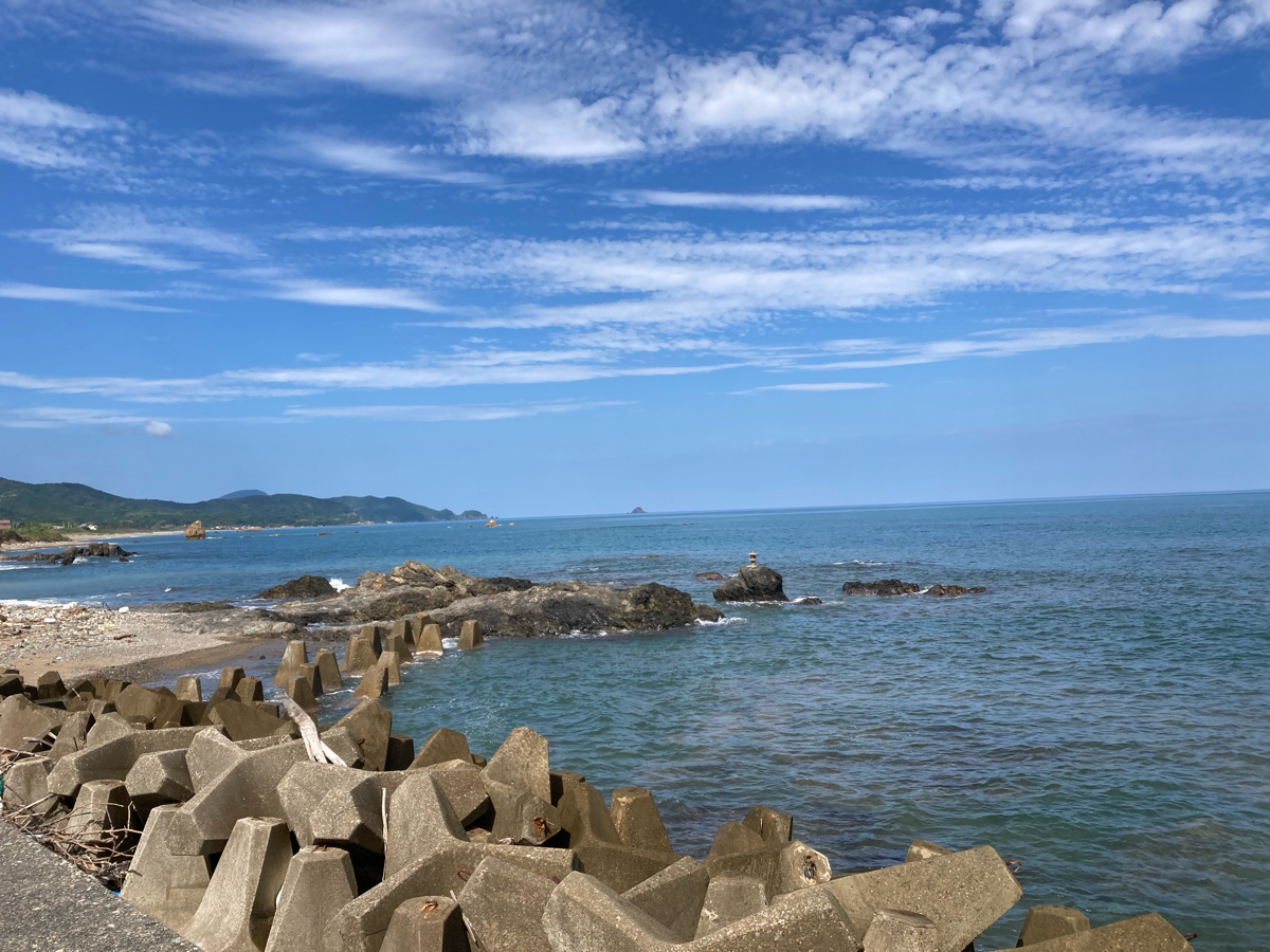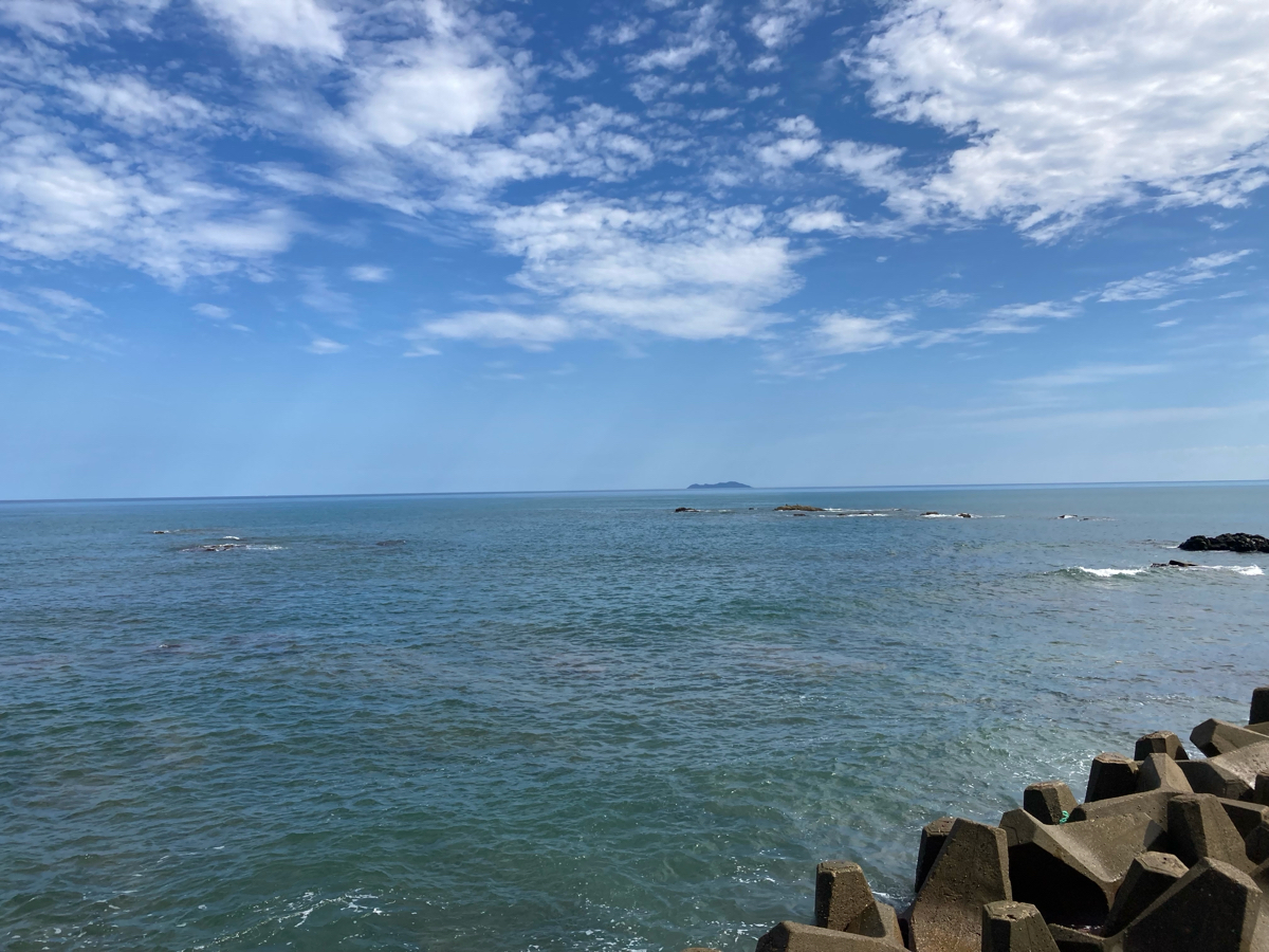益田市高津の海岸から日本海が広々と見渡せます。静かな波の音と虫の声だけ聞こえる戸田小浜。水平線には高島が浮かんでその島には今も人が住んでいるのかはわからないけど。美しいと山陰の景色を観て下さい。