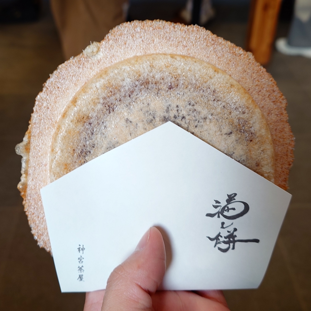 「ふくれもち」と読みます。 北海道神宮の中にある茶屋で、熱々の焼きたてをその場で食べるスタイルです。 北海道産のもち米や小豆を鉄板でギュッと挟んだ一品。 幸福を願っていただきました。