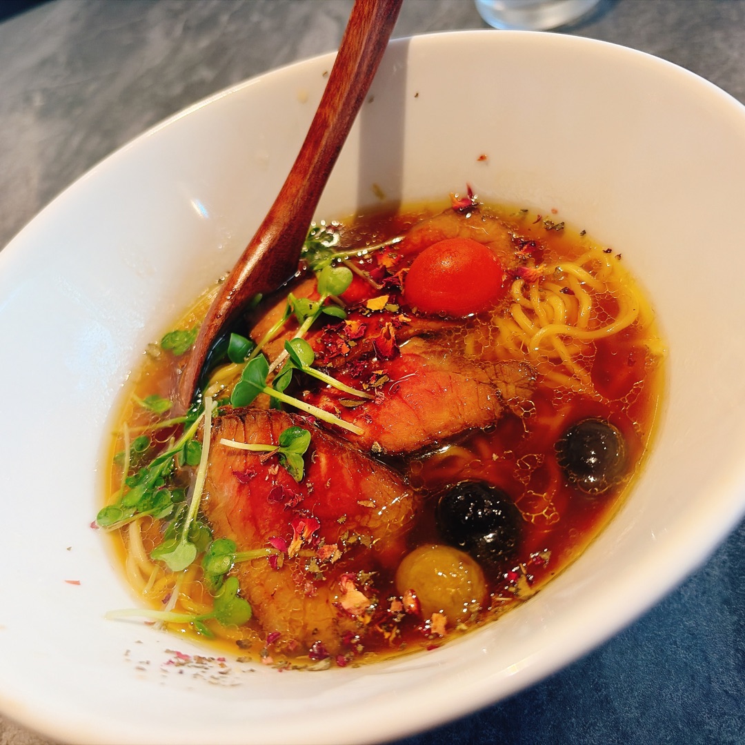 今日のランチは「Cafe Bar YOKATTA」で ローストビーフ麺。 醤油ベースのスープにオリーブオイルの香りが溶け込んでいて、ふっと鼻を抜ける瞬間がたまらない。 オリーブがそのまま入っているのも印象的で、 ローストビーフの旨みをより引き立ててくれた。 店内には音楽が流れ、ダーツやさまざまな物が並んでいて、ほどよく生活感がある。 静かすぎず、気取らない雰囲気が心地よくて、 つい長居したくなる。 そんな空間で味わう一杯は、 まさに「よかった」としか言いようがない。