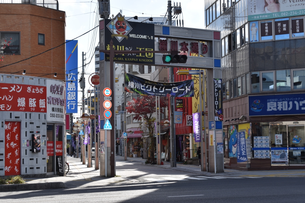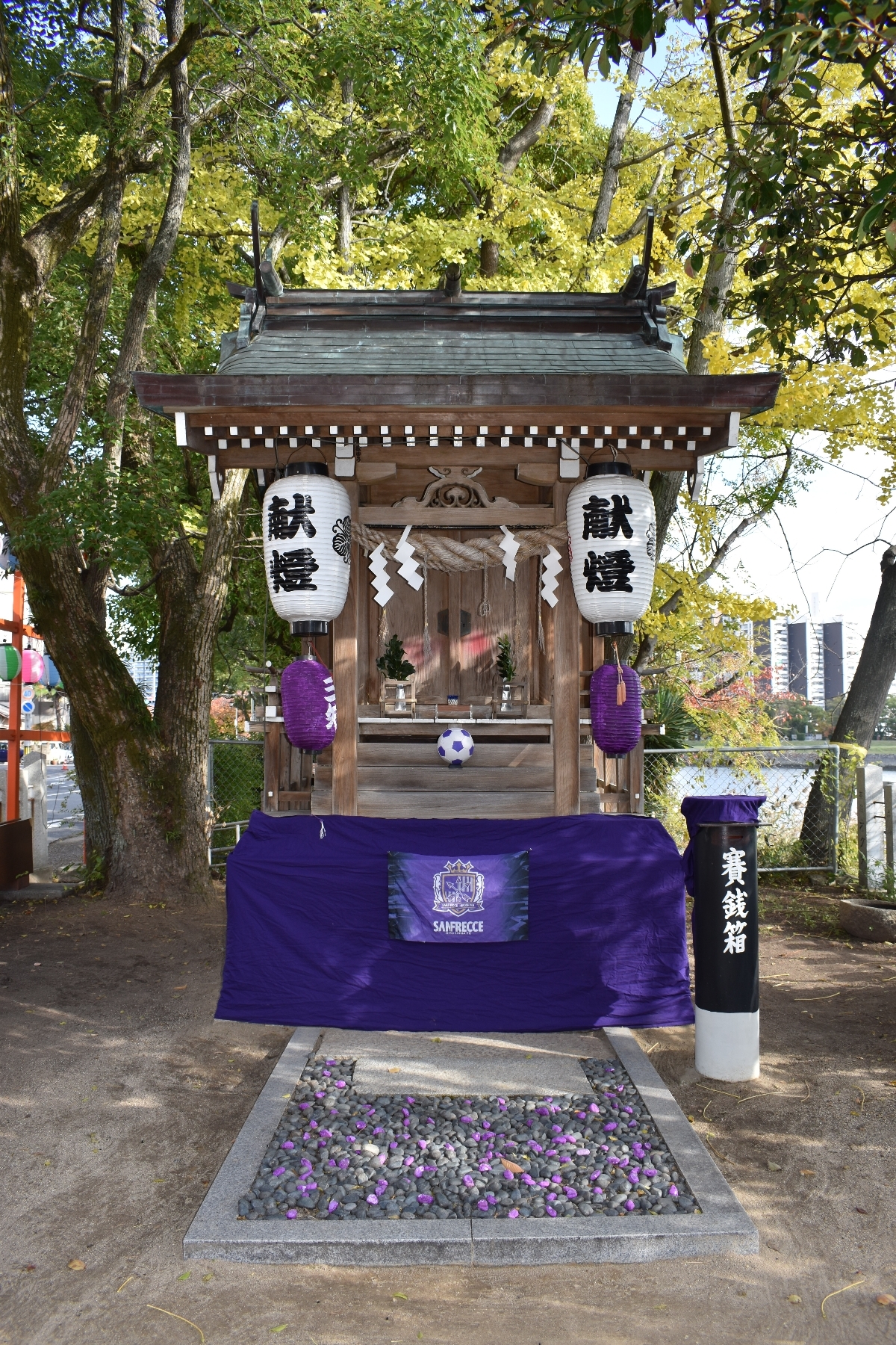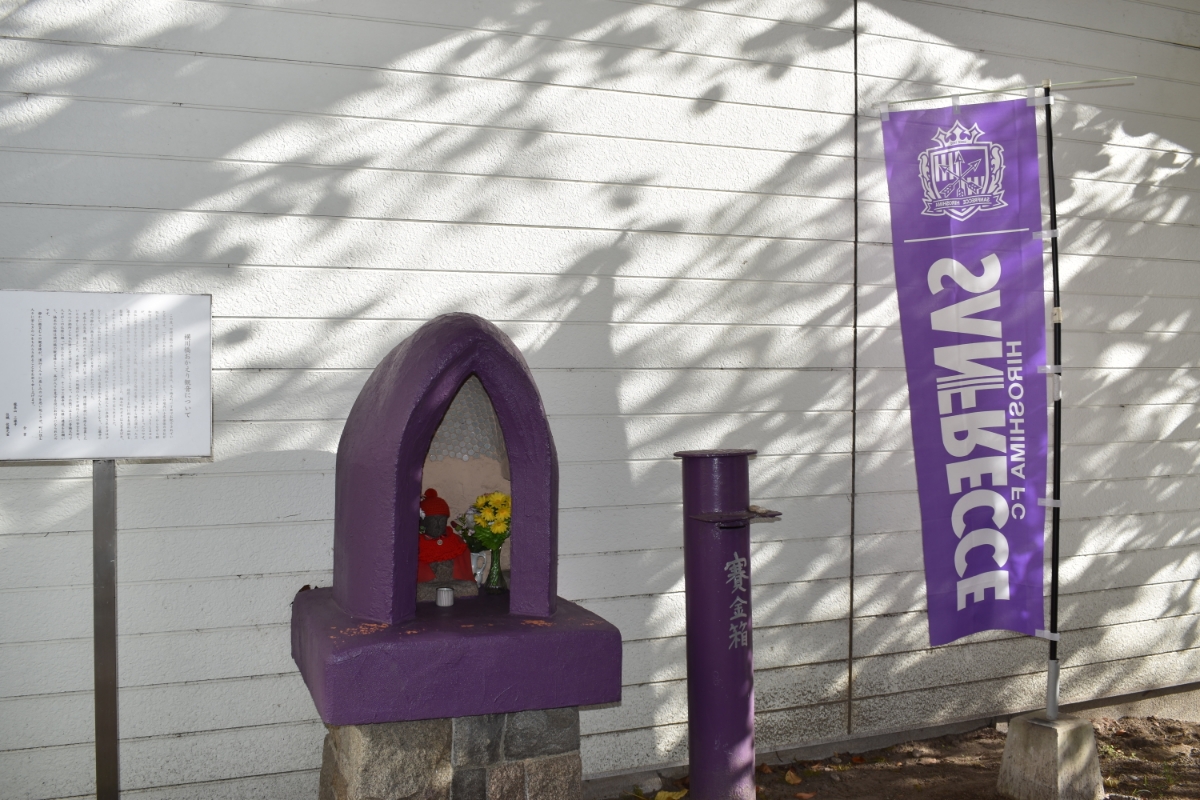 広電横川駅から今年開業した新サッカースタジアム、エディオンピースウイング広島までサンフレッチェ広島の応援に行ってきました。 横川ビクトリーロードを通り川沿いを歩きます。 道には応援ののぼり旗が並び横川胡子神社もサンフレッチェカラーに染まっていました。