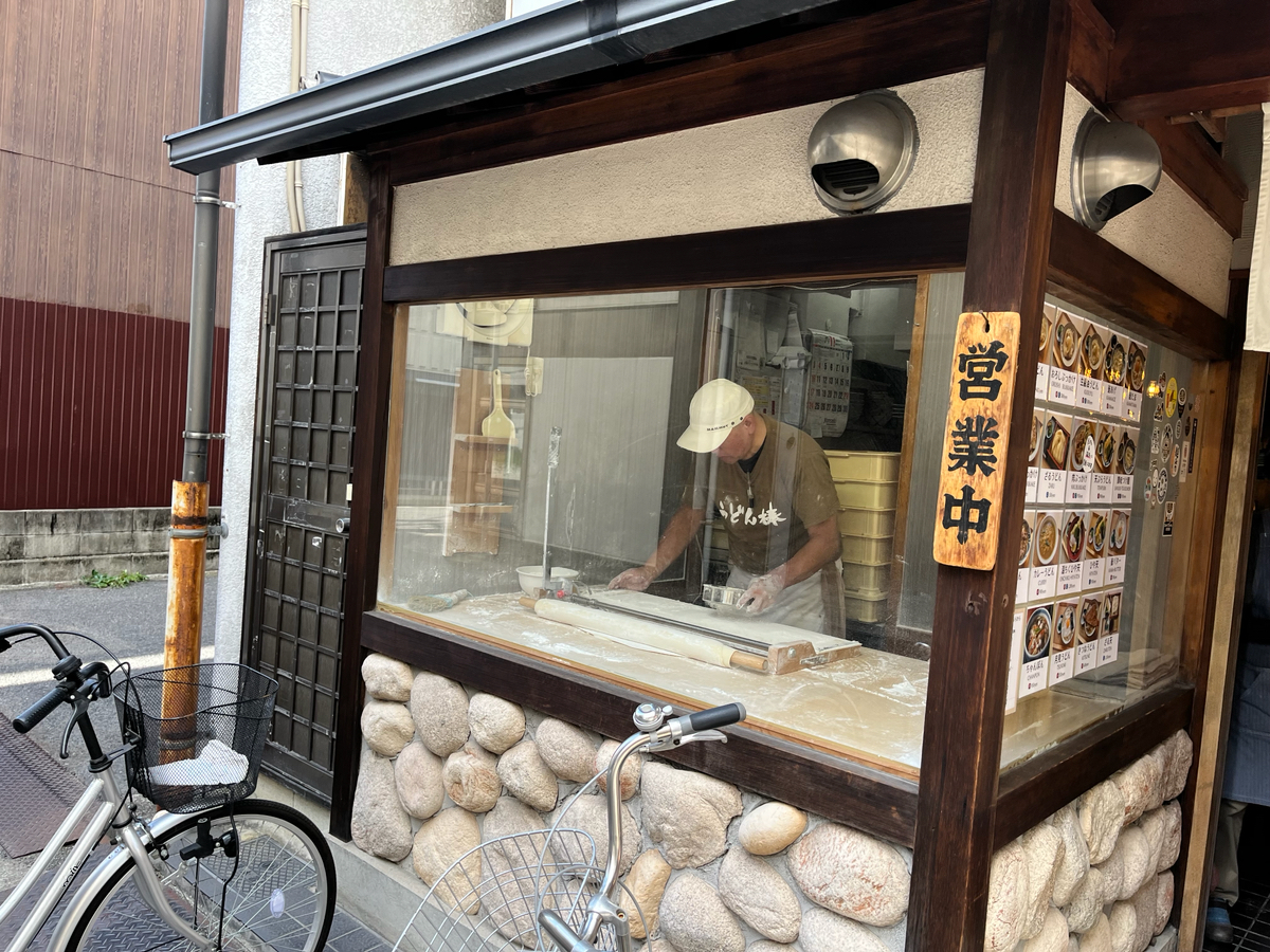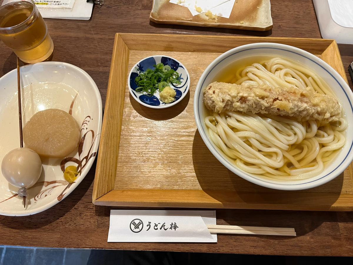 瓦町駅歩いてすぐの場所にある人気うどん店の「うどん棒」さんのうどんは、讃岐うどんの中では細麺で食べやすいです。 天ぷらも揚げたてサクサクで美味しいです。 ぜひ一度食べて下さい。