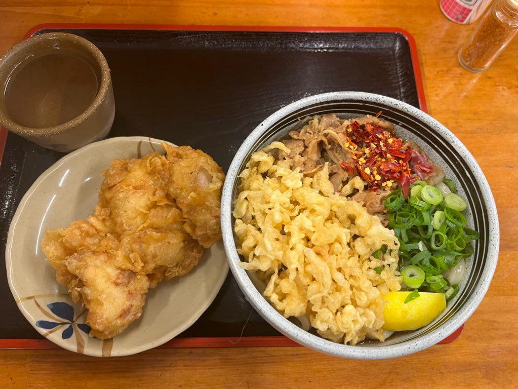 美味しいおうどんが食べたいと、 綿谷さんに二度目の訪問です。 前回はぶっかけ(トッピングなし)にしましたが、 今回は思う存分食べたいと思い、 とり天と肉ぶっかけ(小)を注文。 写真ではわかりづらいですが、とり天はこぶし二つ分くらいあり、 通常の大きさの3倍ほど。笑 うどんも(小)で1玉分とのことですが、 お肉も盛りだくさんで本当に1玉かな⁈というくらい、 食べても食べてもなくなりません。。笑 この二つで710円‼︎信じられないコスパでした。 次はかき揚げを頼みたいです。 ご馳走さまでした😋✨