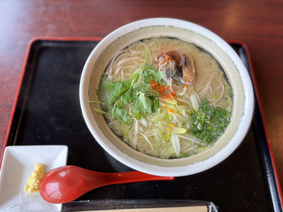 鹿児島市観光農園グリーンファーム内のレストラン「だいだい」で、喜入の郷土料理「豊祭そば」を食べました😊 お蕎麦には珍しくみそ味で、焼き鯖が入っています。優しいお味で美味しくいただきました。 天気が良ければ錦江湾が綺麗ですよ😊