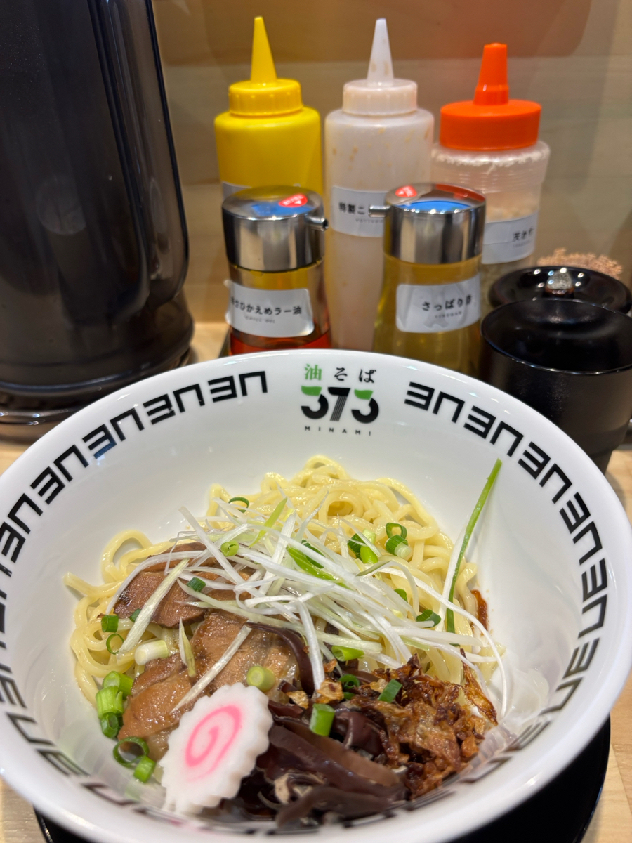 373と書いて「みなみ」と読みます 3種類の香味油から選びます🍜 味変の調味料もバラエティに富んでいます 追い飯にはタレがかかっていて、最後まで美味しくいただきました😋