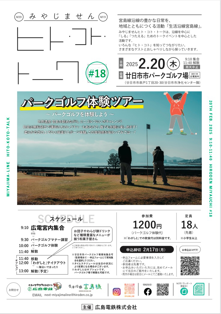 ⚫︎日時 2025年2月20日(木)9:10〜11:40 (パークゴルフのみ参加の場合) ⚫︎場所 廿日市市パークゴルフ場 (廿日市市串戸1丁目20-30) ⚫︎内容 今回は少し足をのばして、パークゴルフ体験ツアーを実施します。宮島が臨めるパークゴルフ場でミニゴルフを体験してみませんか?ミニゴルフ体験後には、廿日市市の和菓子屋さん「わがしと」で一息つきましょう! 〜当日スケジュール〜 9:10 広電宮内駅集合 9:30 パークゴルフマナー講習 10:00 パークゴルフ体験 11:40 解散(予定) ------------------------------ 【オプション(任意参加)】 11:40 移動 12:00 「わがしと」テイクアウト 〜海沿いでまったり 13:00 解散(予定) ※廿日市市パークゴルフ場現地集合も可能です。申込フォームにて「現地集合」を選択してください。 ※タイムスケジュールは当日の状況により変更する可能性がございます。 ※「わがしと」はオプションです。パークゴルフ場での解散も可能です。 ⚫︎参加費 1200円/人(パークゴルフ体験代) (※「わがしと」は別途料金必要) ⚫︎定員 18名(先着)※小学生以上 ⚫︎申込 QRコードより申込みください。 または、Instagramプロフィールの申込フォームより必要事項をご記入ください。 ※Instagramアカウント ↓ @miyajima_line 締切日: 2月17日(月) ※お申込みいただいた方には、改めてメールにて当日のご案内をいたします。 ※雨天の場合は、中止となります。前日にメールにてご連絡いたします。 ★Instagramを立ち上げています 今後もイベント案内やその他情報などアップしていきます。 ぜひ「いいね」「フォロー」お願いいたします! 〜「ヒト・コト・トーク」とは〜 宮島線の豊かな日常を、地域とともにつくる活動「生活沿線宮島線」。 みやじませんヒト・コト・トークは、宮島線沿線のより豊かな日常をつくるため、街の魅力を知り、伝えていくトークイベントを中心とした活動です。