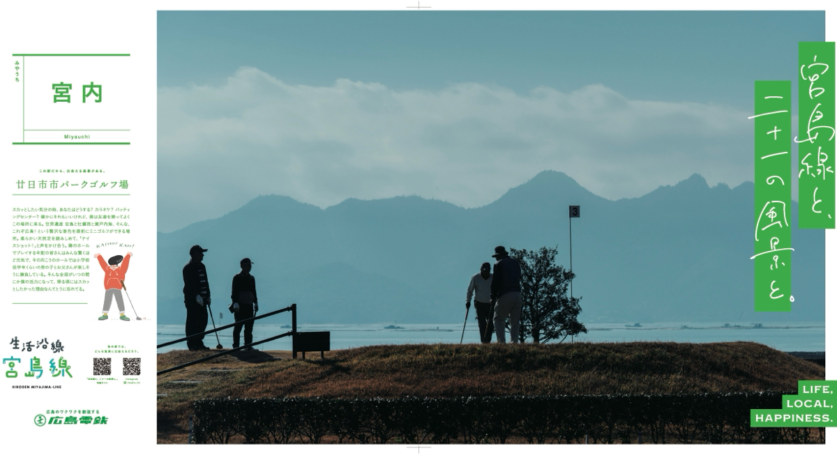 生活沿線 宮島線 広島電鉄の宮島線全駅がポスター展会場に。 広電西広島駅から広電宮島口駅までの21駅を会場に、1駅1枚、全21種類の「この駅で出会える風景」ポスターを期間限定展示中です。 いざ、各駅を巡る展覧会へお越しください。