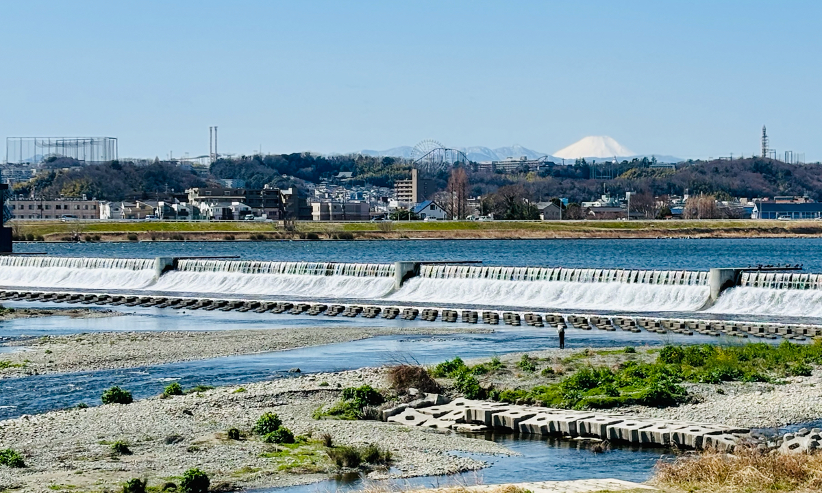 多摩川沿いをサイクリングしていたら、見事な雪化粧の富士山が現れました。青と白のコントラストが清々しい気持ちにさせてくれます。 調布グラウンドの近くで撮影(2025年3月)