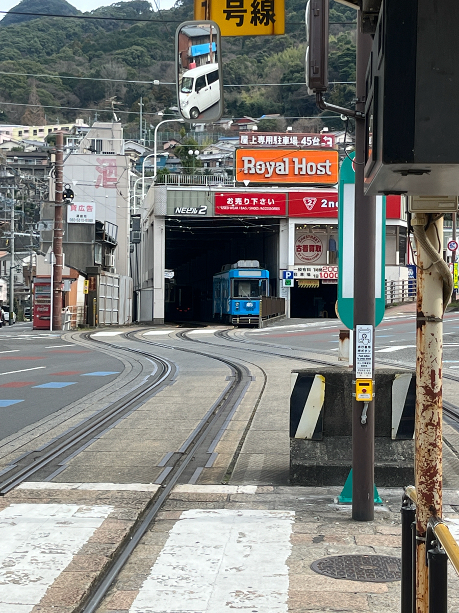 長崎の路面電車は過去にも乗ったことはありますが、ここには初めてやって来ました。広い道を跨いだところに折り返しがあるところは珍しいのではないかと。