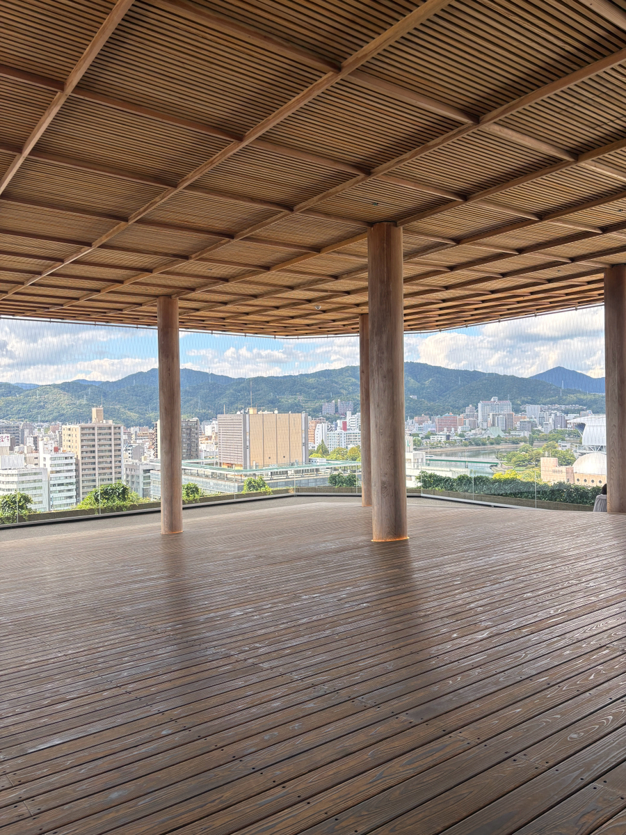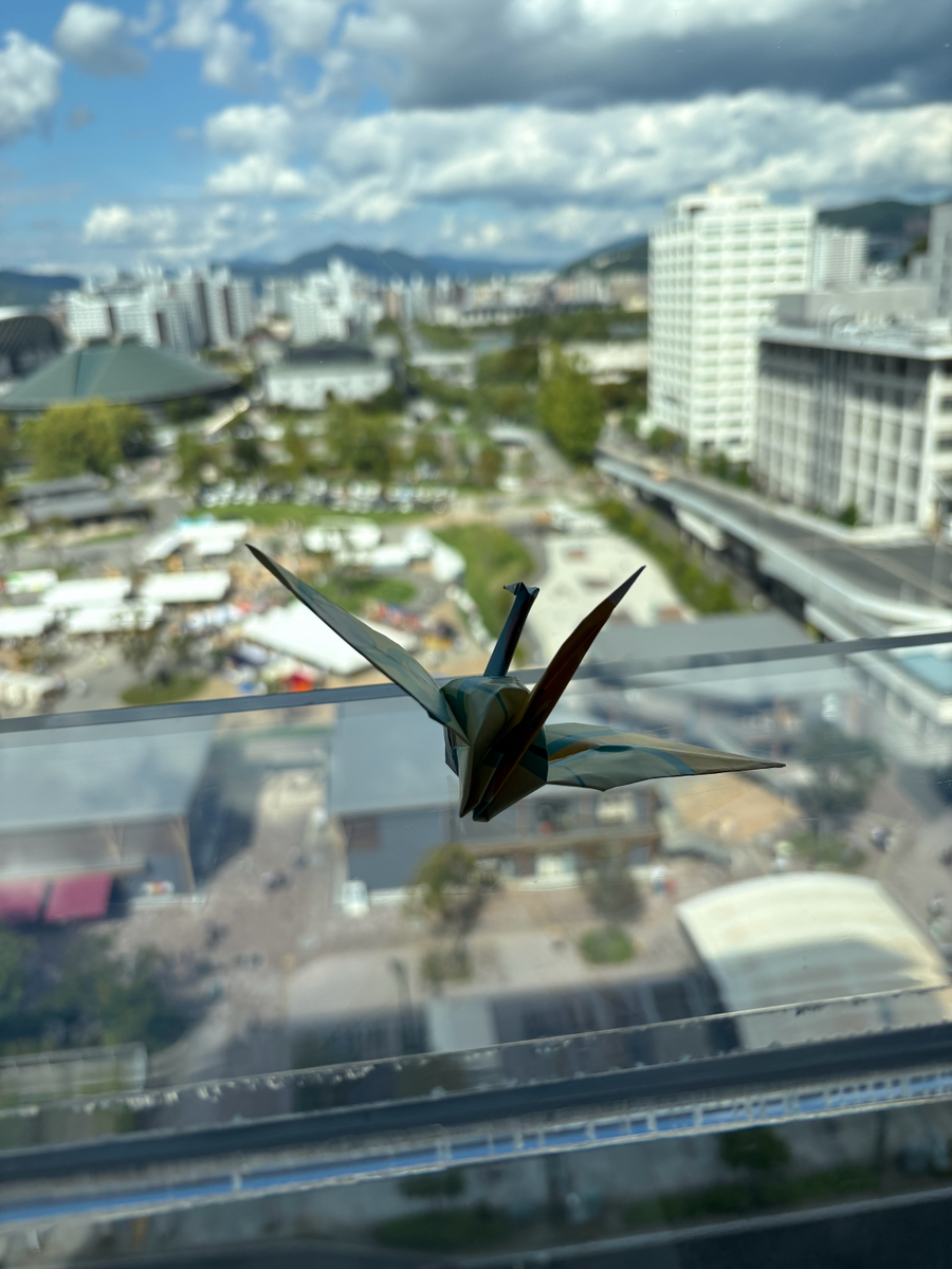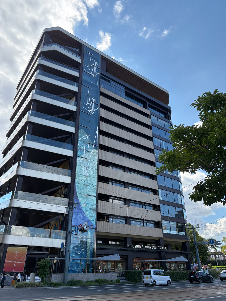 原爆ドームの隣にあるおりづるタワーの有料エリアに行ってみました。 素敵な展望台では原爆ドーム周辺が見渡すことができ、カフェで買った飲み物でゆっくり過ごすことも出来ます。爆心地周辺の歴史も学べる場所の中、ぜひともおりづるを折って「おりづるの壁」に投下して平和への想いに積み重ねてもらえたらと思います。 2200円と少し高いイメージでしたが、行ってみると価値のある場所でした。 当日であれば出入りが自由なので、明るいうちに一度行った後に夜に再訪問するのも良いかなと思います♪