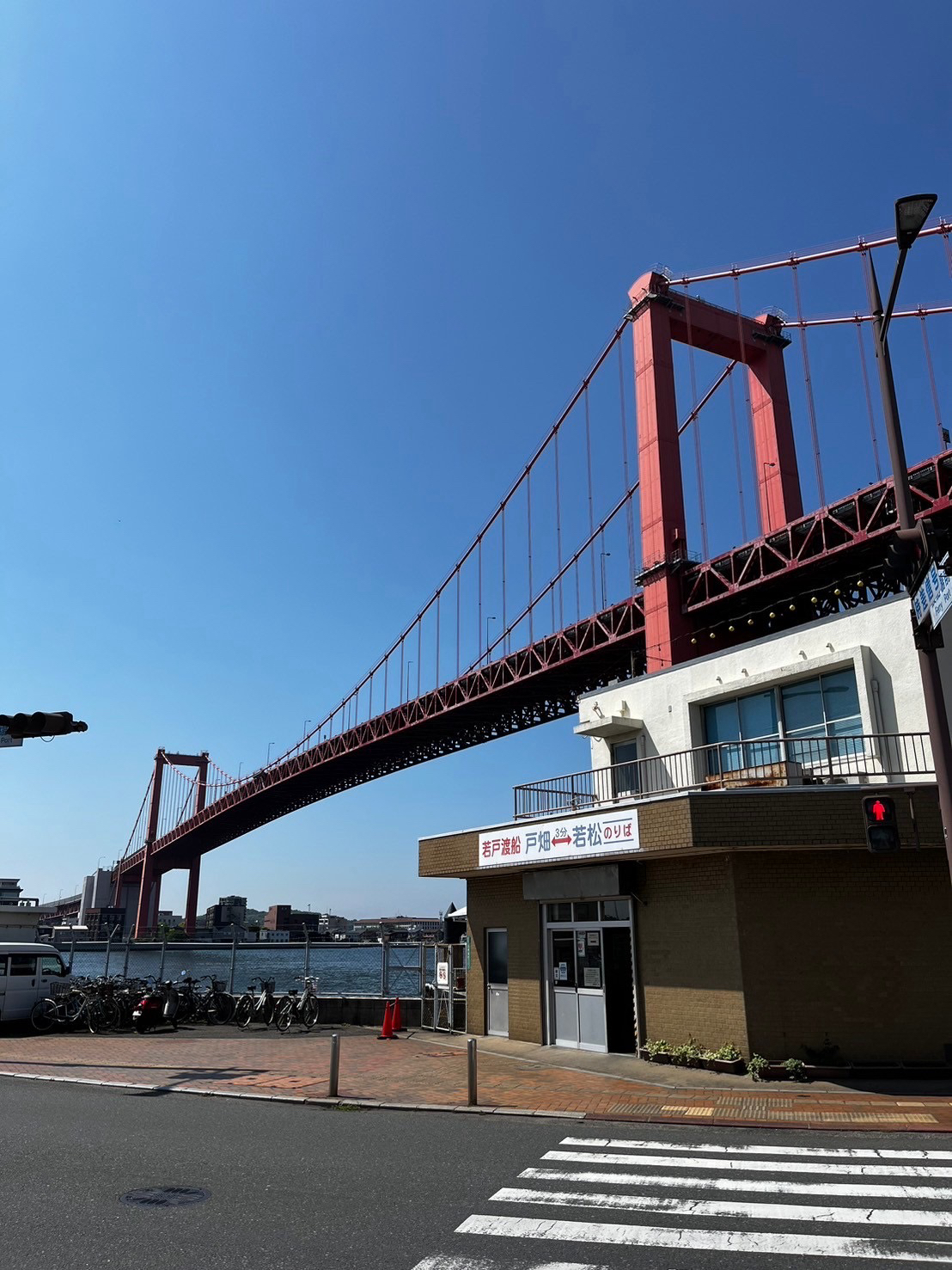 北口ロータリーからまっすぐ伸びた道を徒歩8分で渡船場に到着、100円でレトロ建築が点在する若松に船で渡れます。