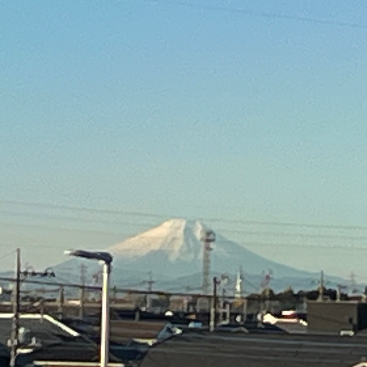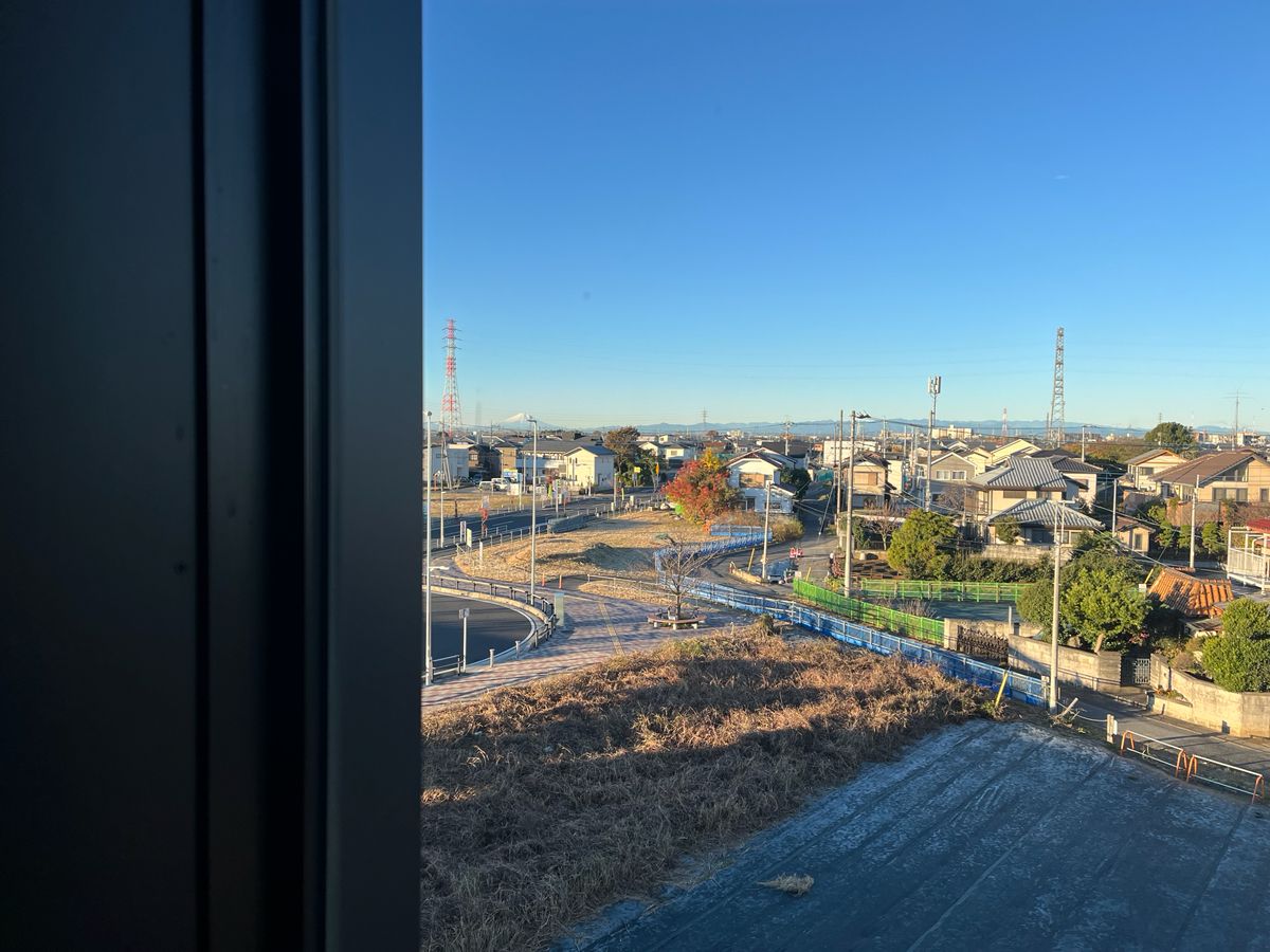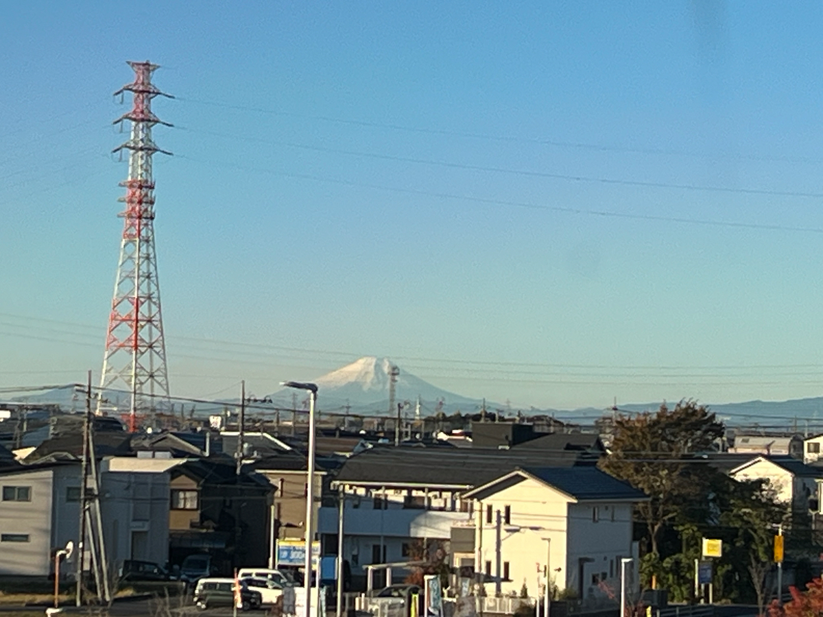 寒い冬は通路窓から富士山展望できます。電灯の位置が残念なるも、絶景。