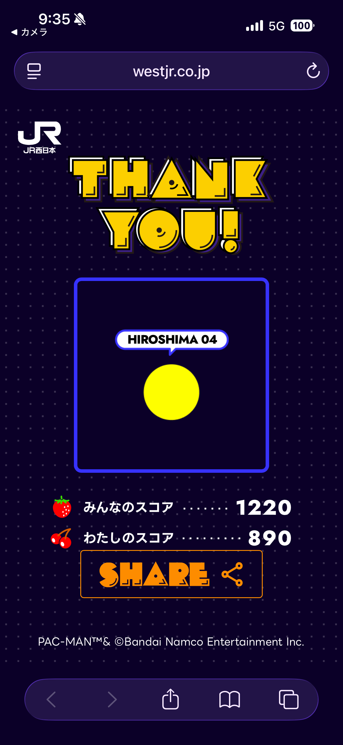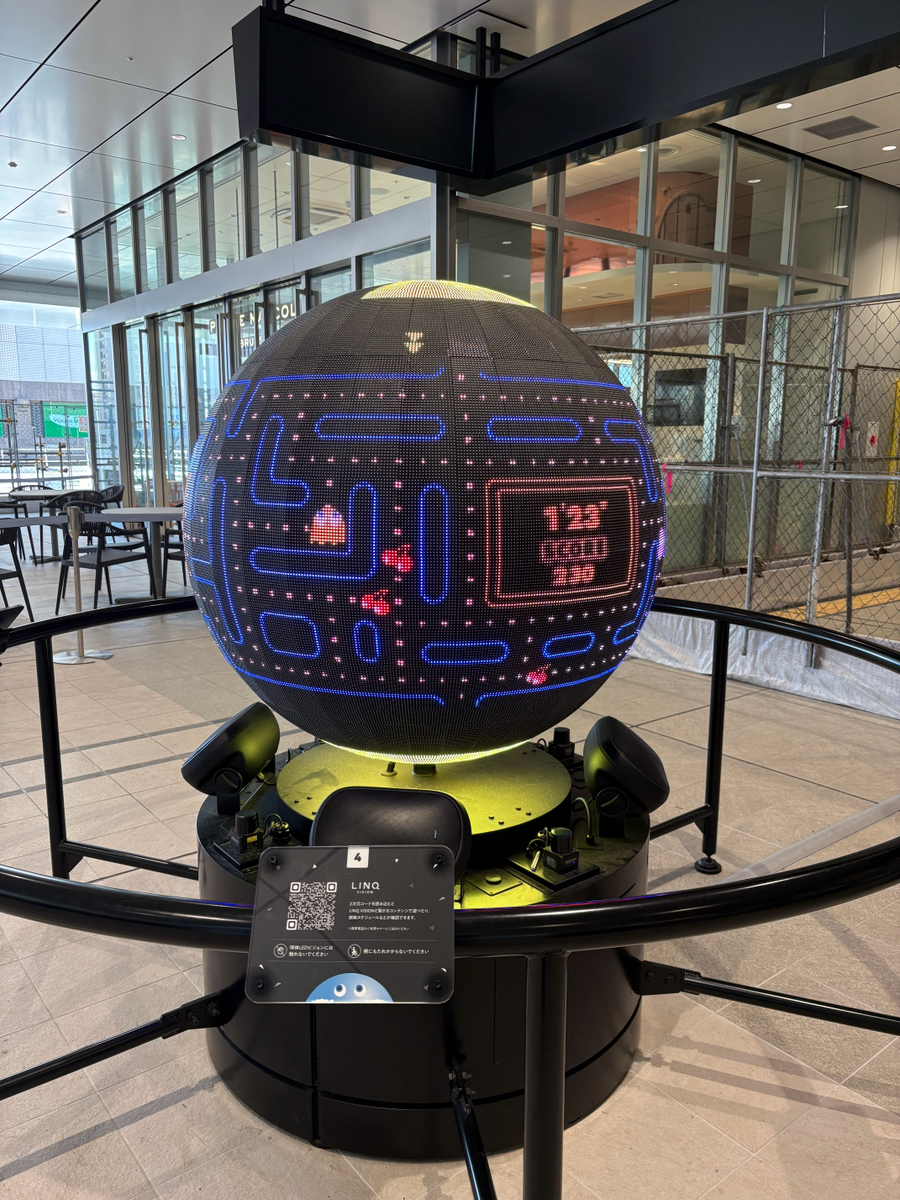 広電広島駅の乗り場すぐにある不思議な球体。 近づくとパックマンのゲーム画面が。スマホと連携しすぐにスマホでパックマンが操作でき、電車の待ち時間に楽しめました。 スコアも競えるみたい!