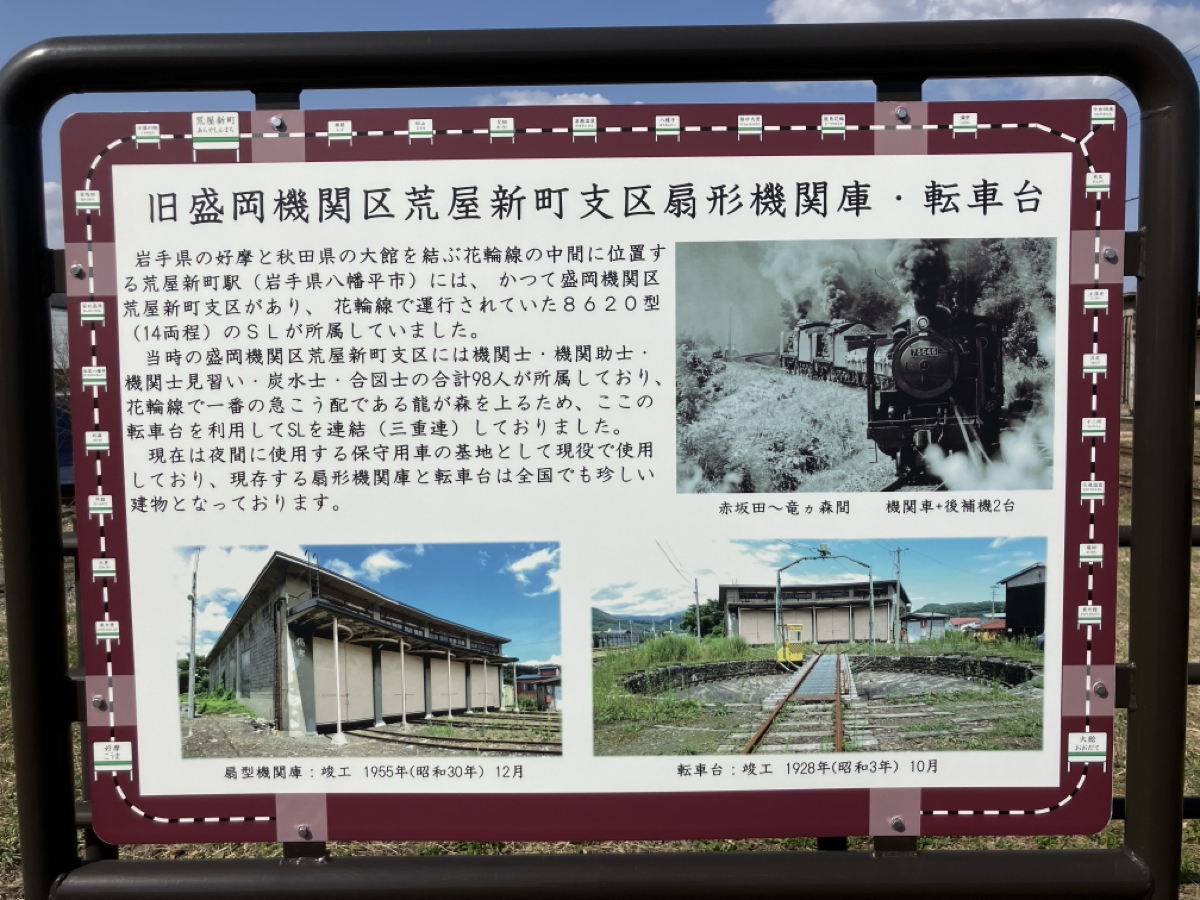 8620が活躍していた頃の構内の詰所や水タンク、石炭所などはとっくに無くなっています。駅前の和菓子屋さんも営業していないなど駅周辺は寂しくなり、今や無人駅となってしまいました。でも機関庫と転車台が残っています。 駅舎内と機関庫そばには、当時の解説パネルがあります。