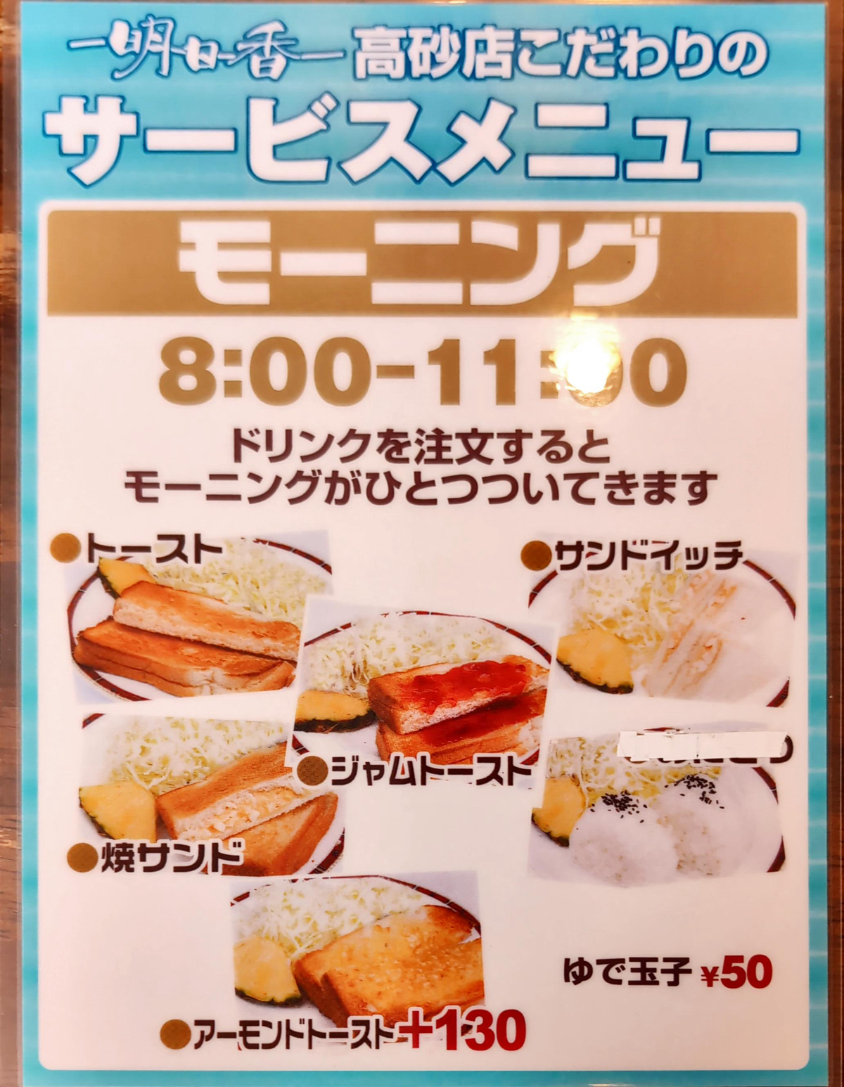 朝のモーニングで、利用しました。 ドリンクをたのむと、何種類かのトーストのうちから、どれか一つ無料でチョイスできます。