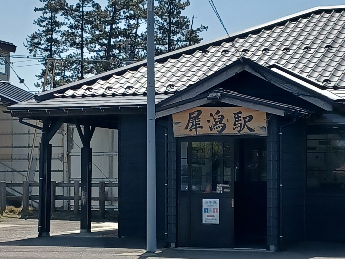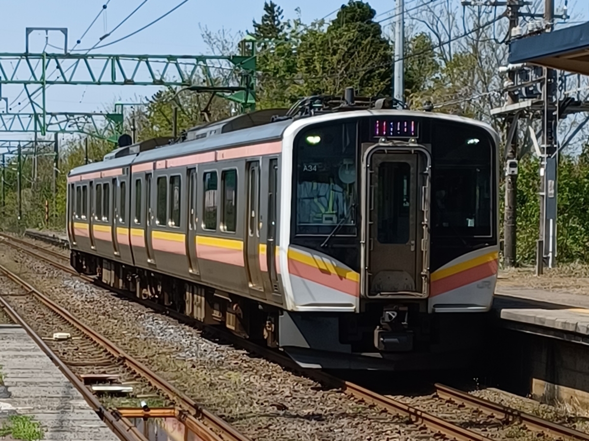 ホクホク線と信越線が停まる駅。 遠くに妙高の山々が見えます。