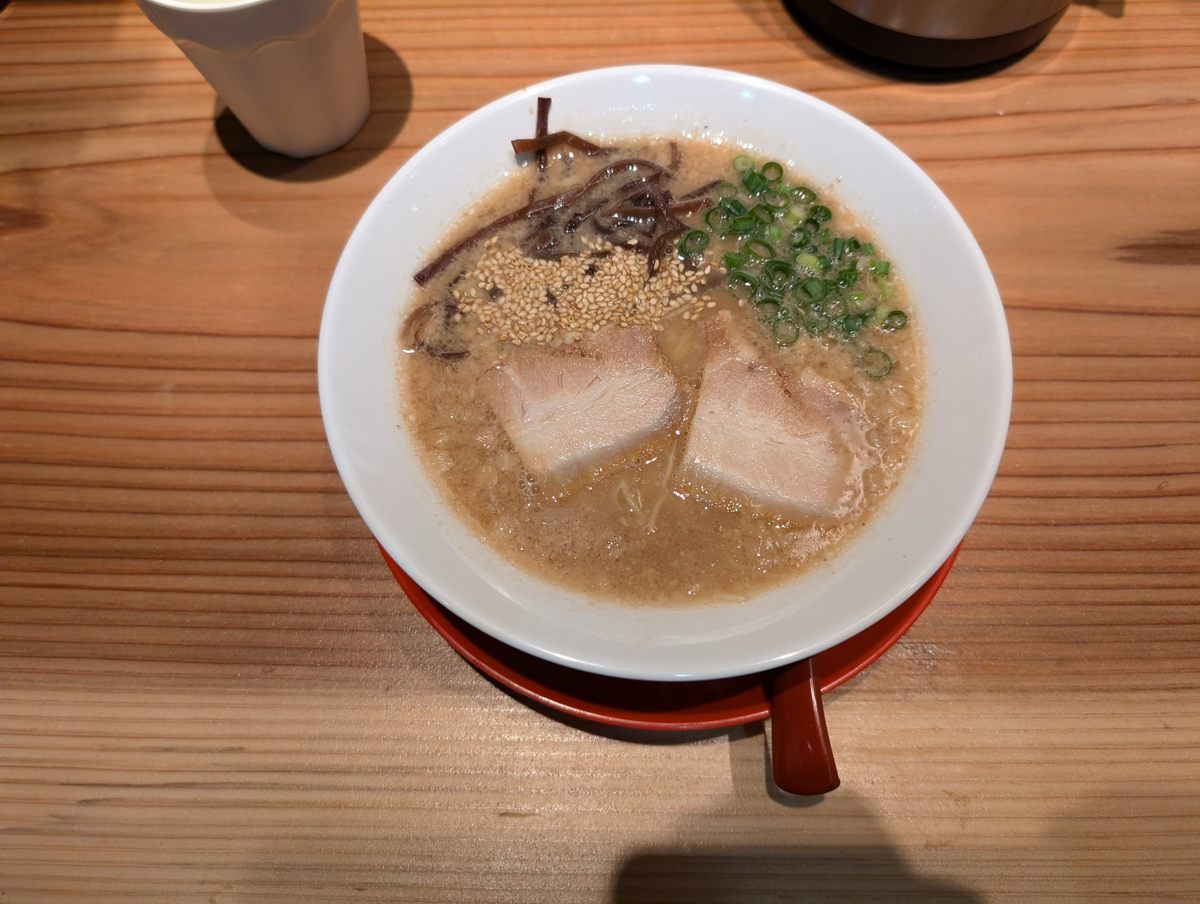 最近オープンしたばかりのラーメン屋さんです。 一番ベーシックな白豚骨ラーメン ¥790 なんと、驚きなのは、替え玉が、2玉まで無料という、サービス満点のお店です。