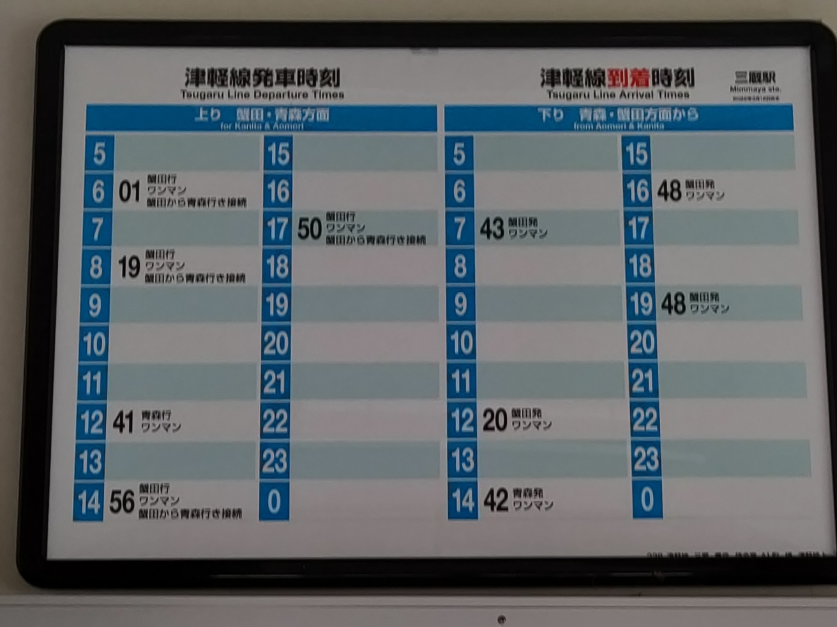 2022年夏の豪雨で、蟹田から三厩間が不通になりました。 普段から乗降客が少ない区間。 JR東日本も復旧に多額の費用がかかることから、現在も着手してません。 このままなら廃線になり、この駅も閉鎖される事になるでしょう。 時刻表の通り、1日の本数ももう来ない駅。 寂しいですね