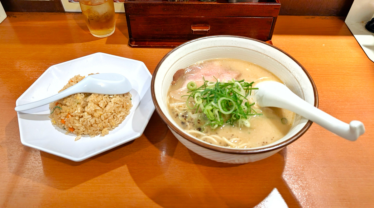 昔からあるラーメン屋さんです。 半チャーハンと、醤油とんこつラーメンのセットで、890円