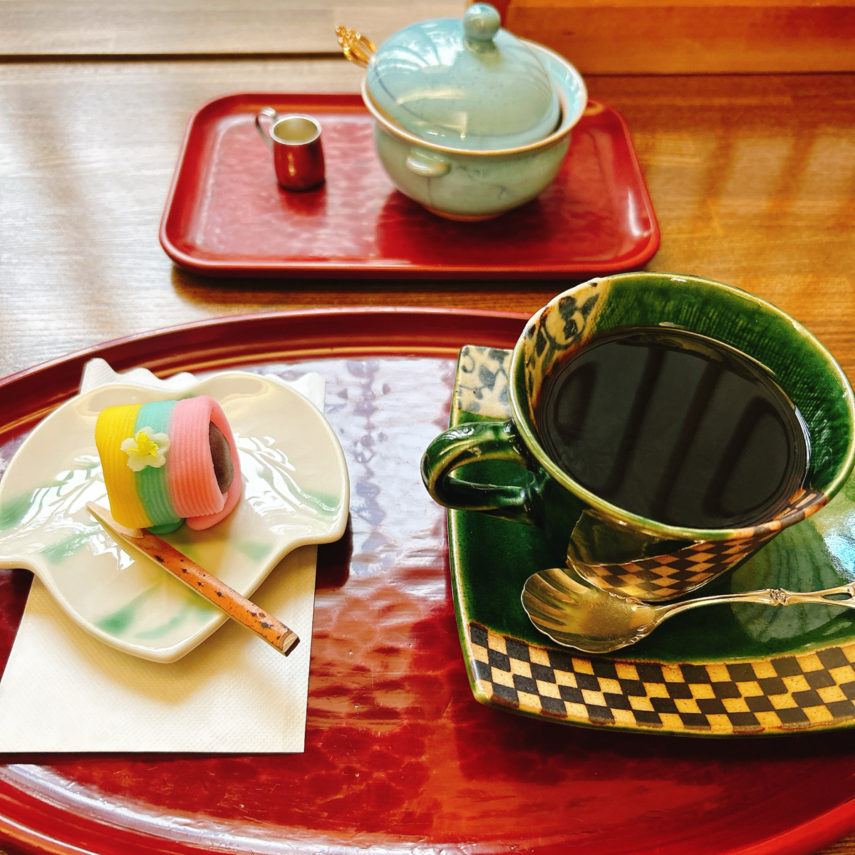 三島駅北口から少し川沿いに歩いたところに、和の甘味を味わえるお店があります。 『欅』さんをご紹介します。 今回いただいたのは、和菓子と珈琲というメニュー。和菓子はその時により違うものが提供されるとのこと。 その他にも、パスタや和の甘味等の軽食もあります。三島の湧水を使った珈琲や、料理を是非ご堪能ください。