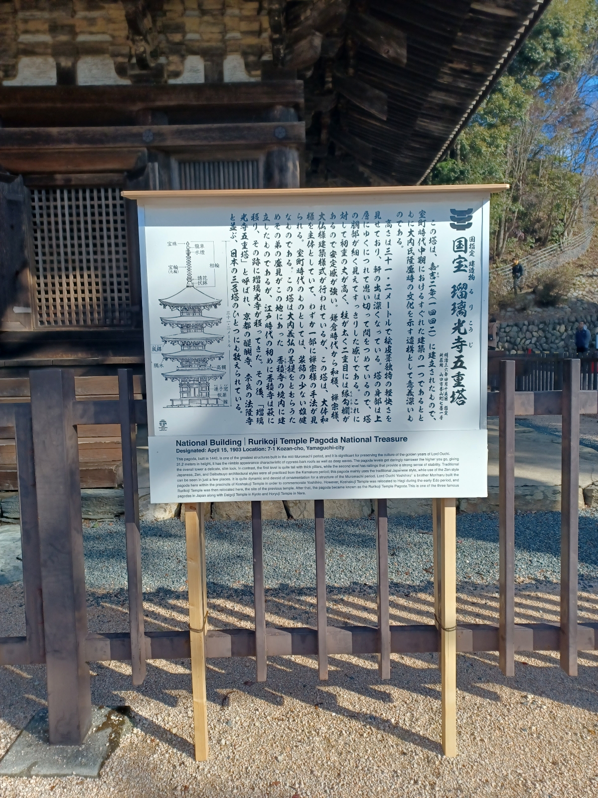 【国宝・瑠璃光寺五重塔】 奈良の法隆寺五重塔、京都の醍醐寺五重塔とともに日本三名塔に数えられている国宝。 現在、令和の大改修中で工事終了は2026年3月の予定。