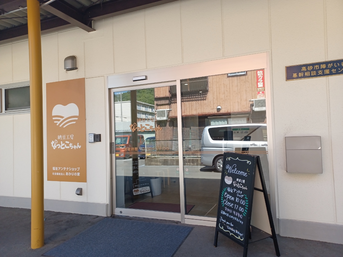 『納豆工房_なっとこちゃん』 社会福祉法人あかりの家ワークホーム高砂が設立した福祉事業所で、納豆の製造と販売をしている福祉アンテナショップです。 事業所の2階が直売所になっています。 国産の豆にこだわった納豆は、粒がビックリするぐらい大きく、ふんわりもっちり食感。 スーパーに売られているものとはまったく違う美味しさです! 一度食べたら、納豆の概念が変わりますよ~ ぜひ、試してみて~。