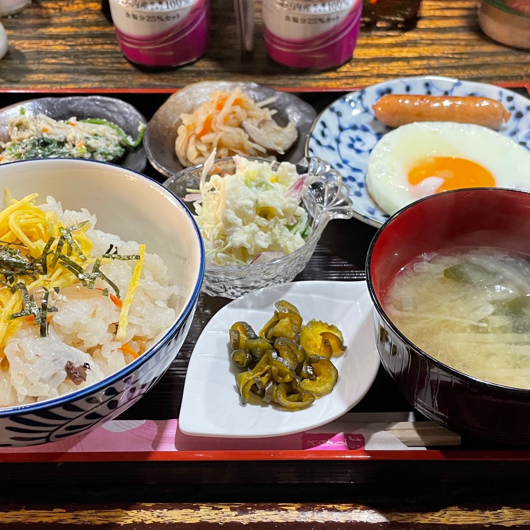 朝ごはんメニューが充実してる喫茶店です。きょうの朝ごはんセットはお寿司ごはん、目玉焼きやサラダや小鉢も付いて朝からしっかりいただきました。