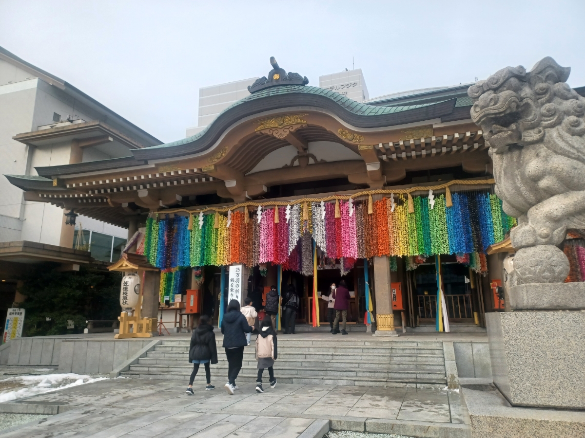 『佐佳枝廼社 (さかえのやしろ)』 福井城址近くに建つ神社。 福井城内に社殿を建立し、東照宮権現様(徳川家康公)をお祀りしたことが始まりとされ、越前東照宮とも言われている。 社殿には、25万羽の千羽鶴が飾られており、 その様は、まるでレインボーのカーテンのよう。 この折り鶴は、コロナ終息を願って始まったそうですが、今は全ての“禍”を乗り越えられるよう願いが込められている。 皆が幸せでありますように(^-^)