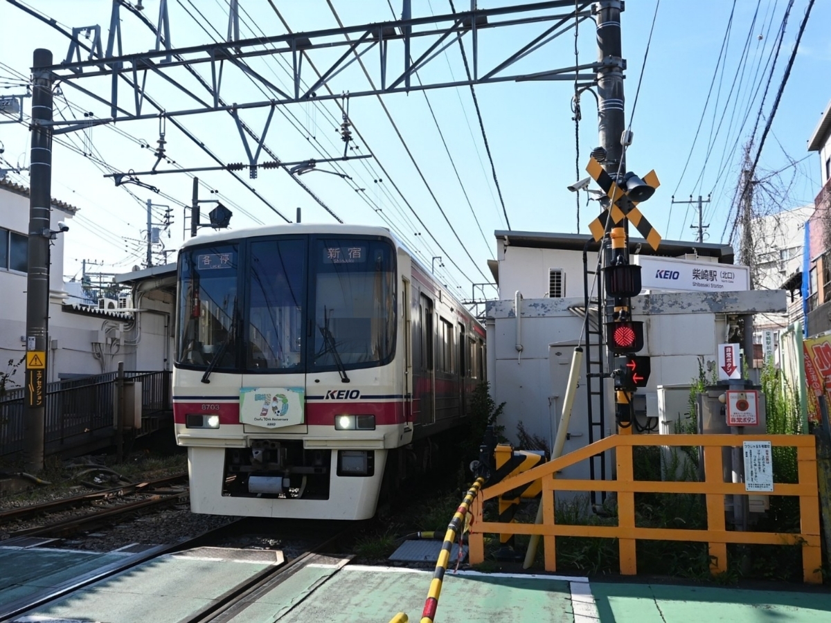 祝!調布市制施行70周年 柴崎駅を発車する記念ヘッドマーク付き8000系電車