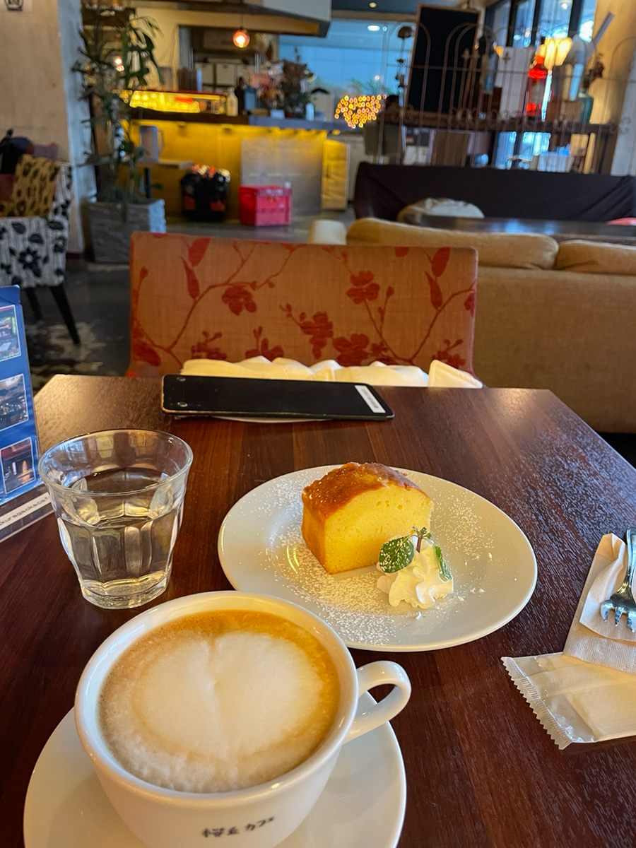 カプチーノとブランデーケーキ 音楽のセンスが良くて、ゆったりした空間でリラックスできるカフェです