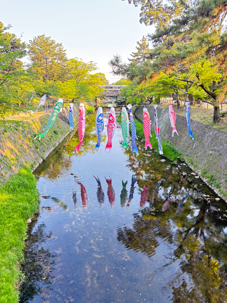 川の上をゆらゆらと泳ぐ鯉のぼりと、その後ろに走る電車 時間がゆっくり流れているようなそんな感じ。