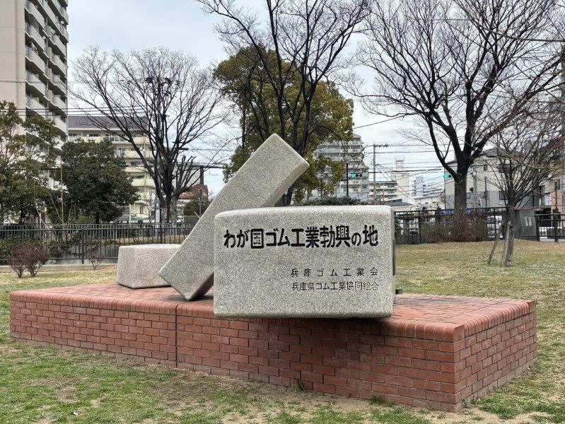新長田駅から徒歩13分、長田区川西通にある石碑です。神戸市は明治以来、神戸港での生ゴムの輸入が盛んで、長田区はゴム工業勃興の地といわれています。タイヤで有名なダンロップが日本で初めて工場を設立したのが神戸だとか。