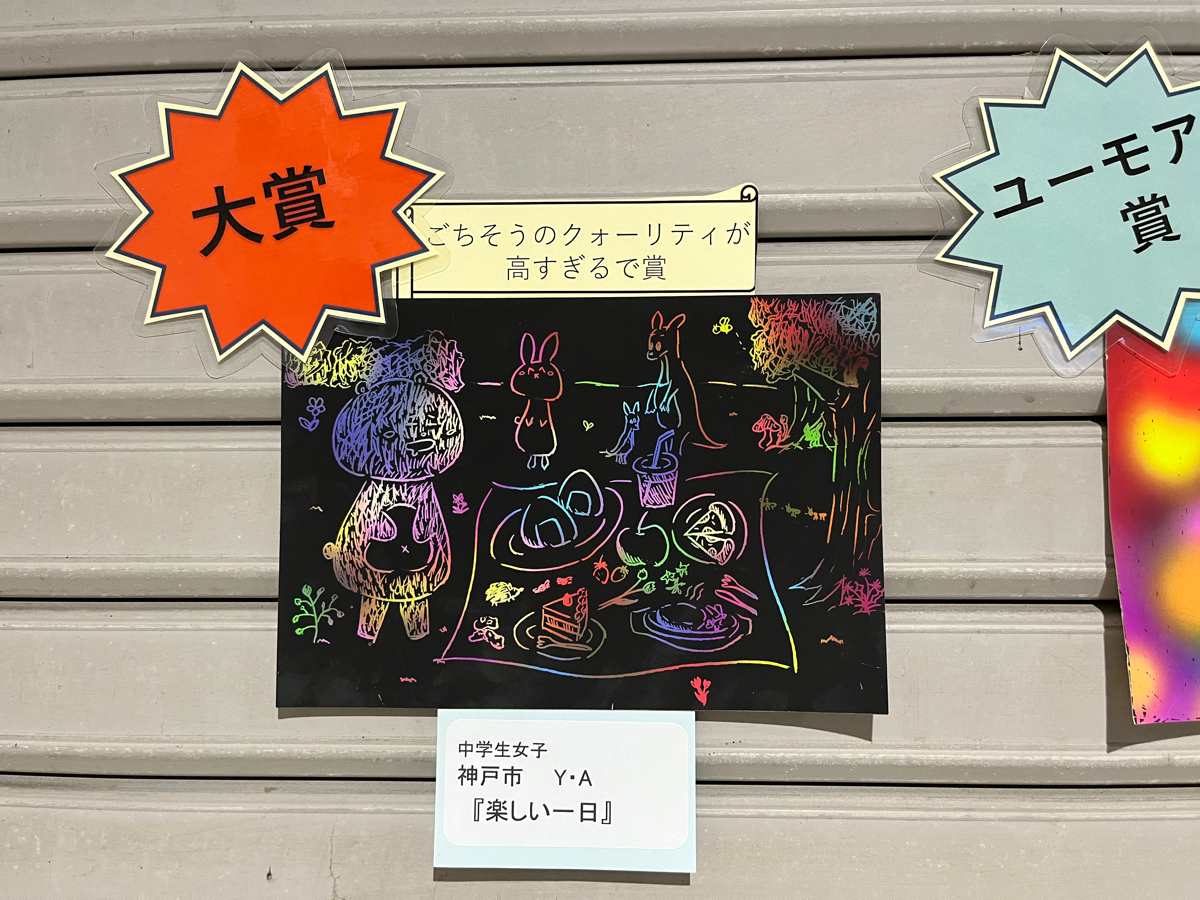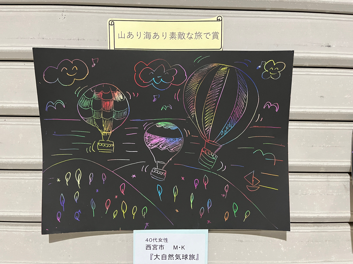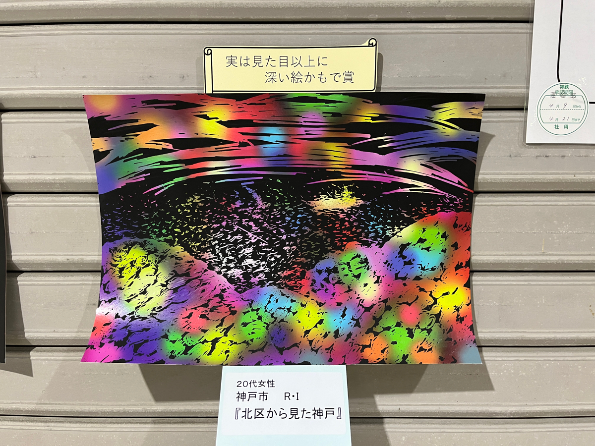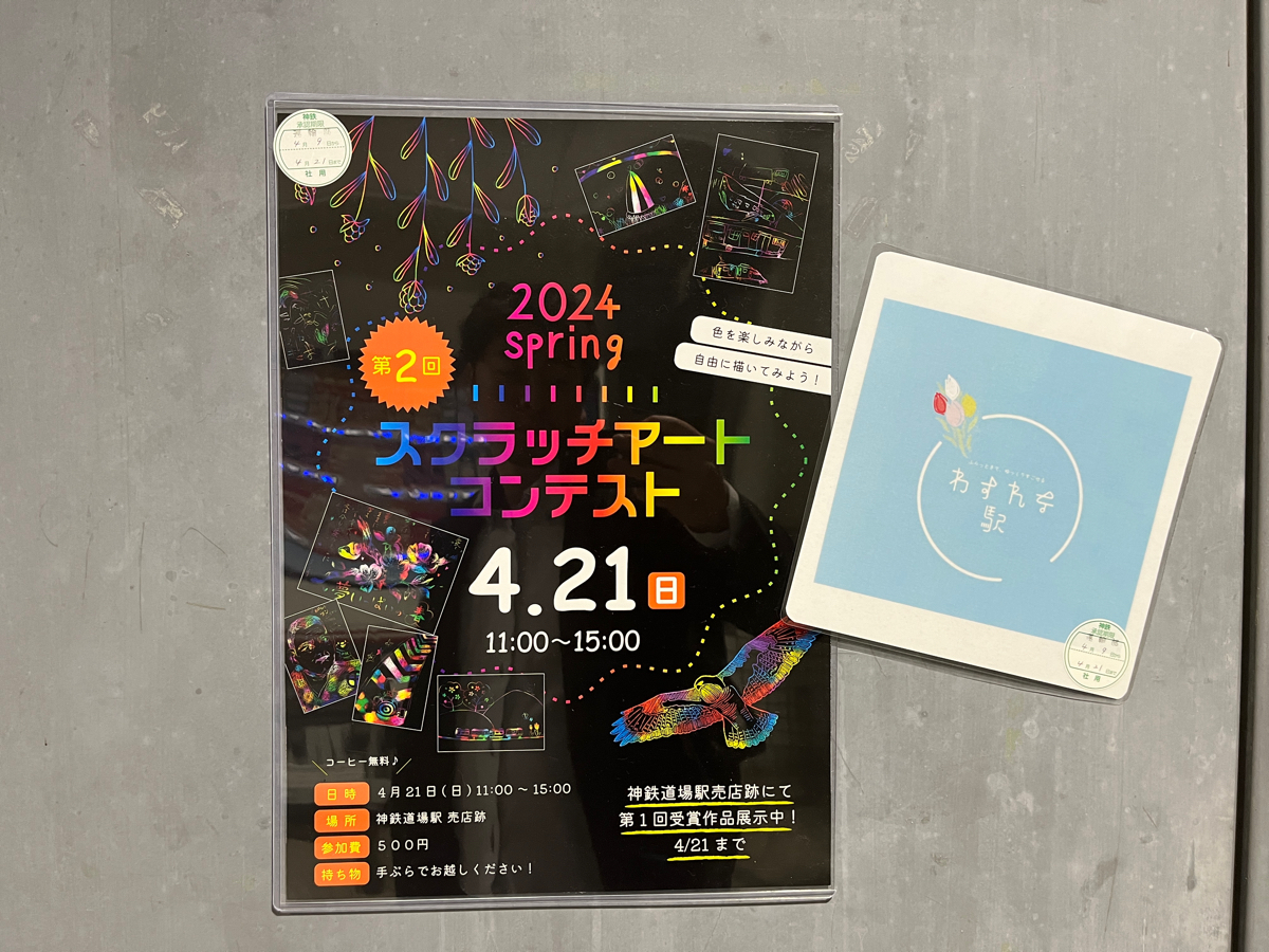 神鉄道場駅の改札を出たすぐにスクラッチアートの表彰作品が出てました!! 第二回も4/21締め切りなので、次の作品も楽しみにしています♪