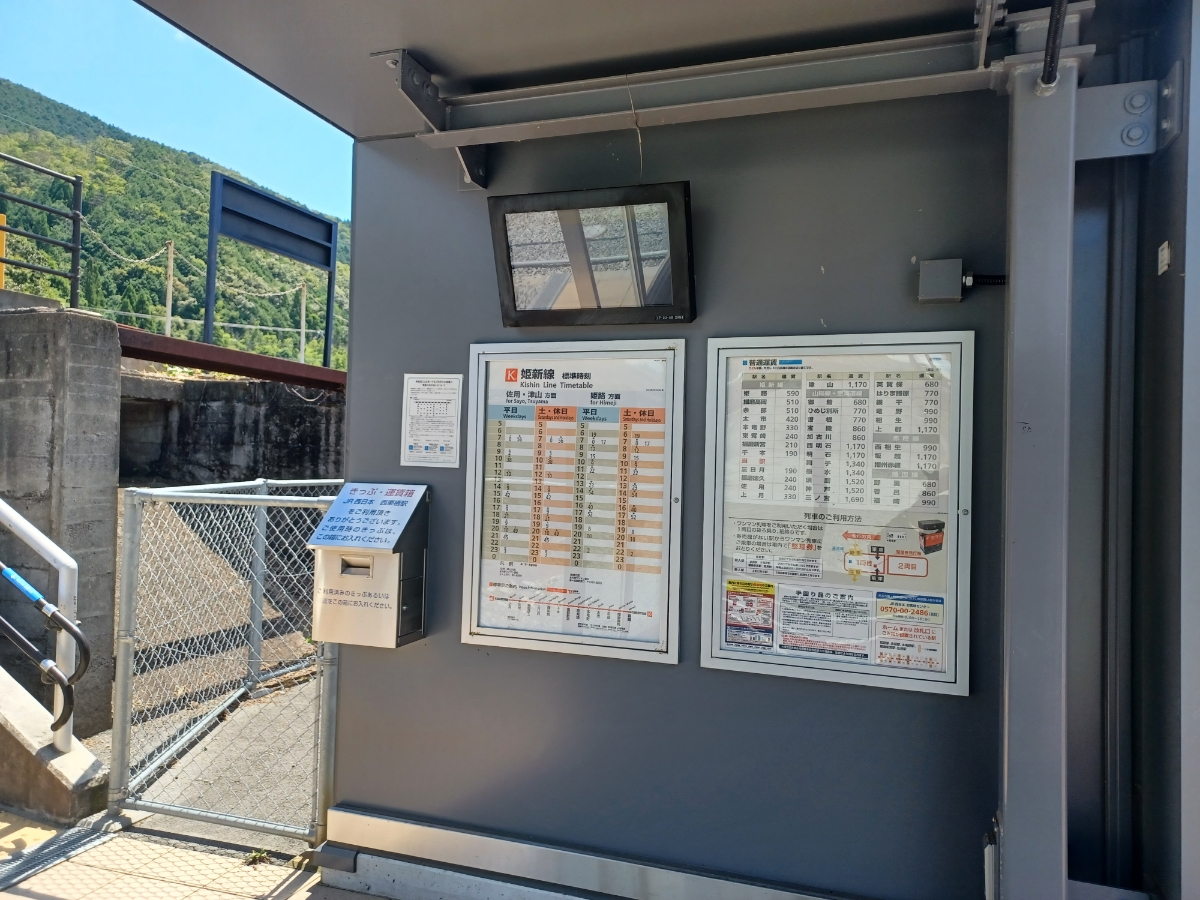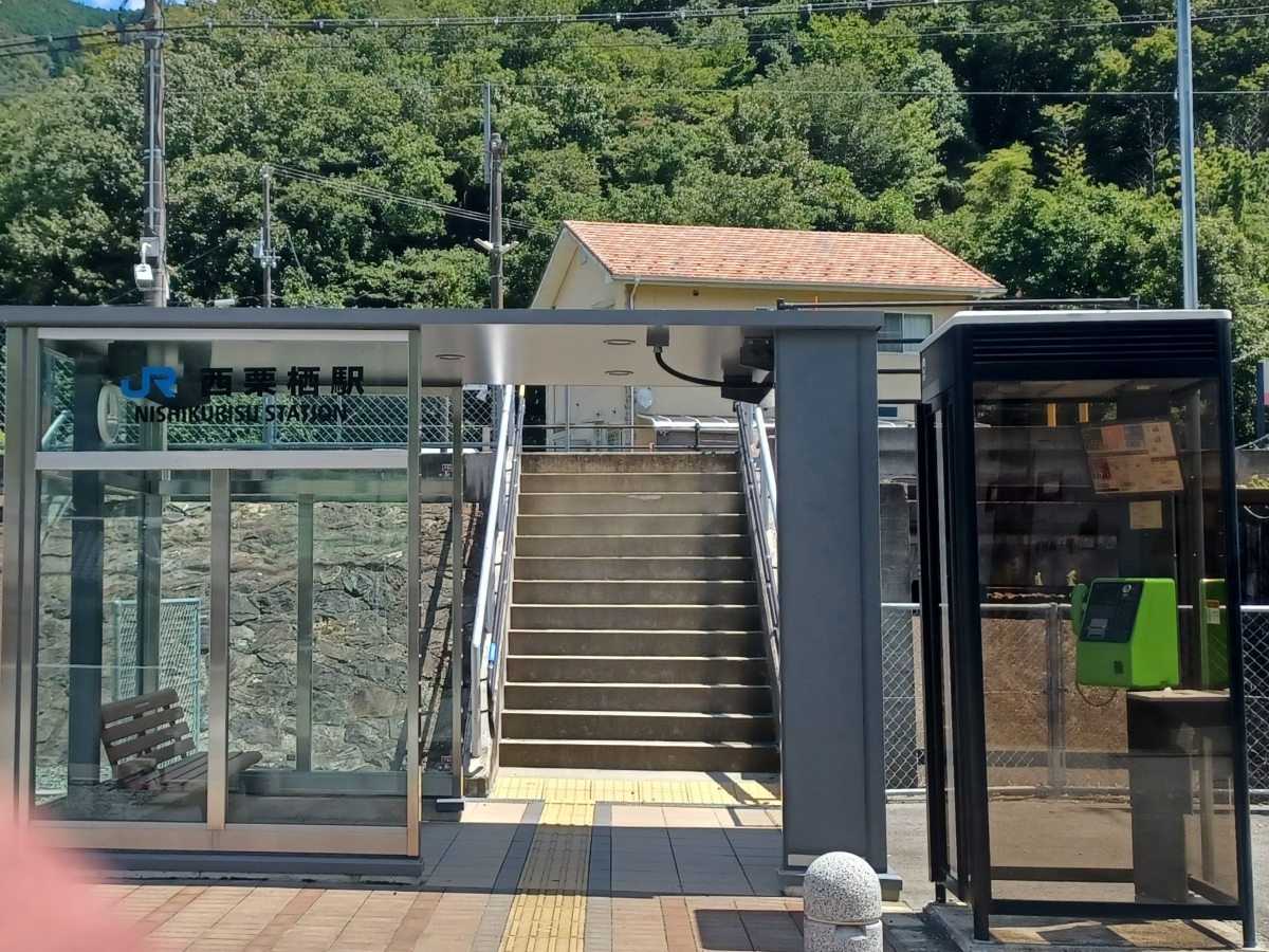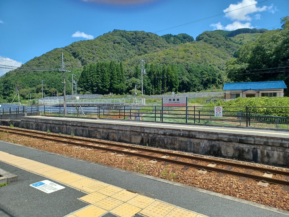 西栗栖駅はJR西日本姫新線の無人駅です。 駅舎はスケルトンで、改札も券売機はなくイスと時刻表があります。 無人ですがトイレがとてもキレイに管理されていました。 2線で、反対側のホームに行くにはホームの端まで行き、線路を渡らなければならないのでご注意ください。 近隣には、国の研究機関である大型放射光spring8があります。 4.8キロ、徒歩で80分、、、。