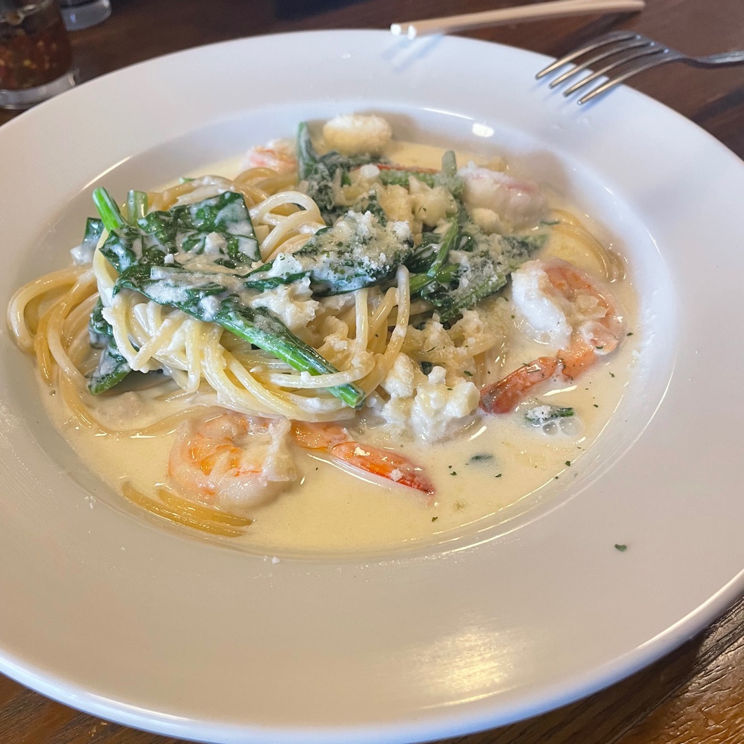 海老とガーリックトマトクリームソースパスタ