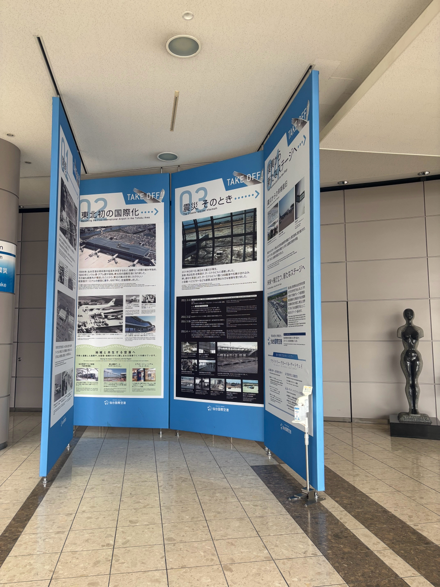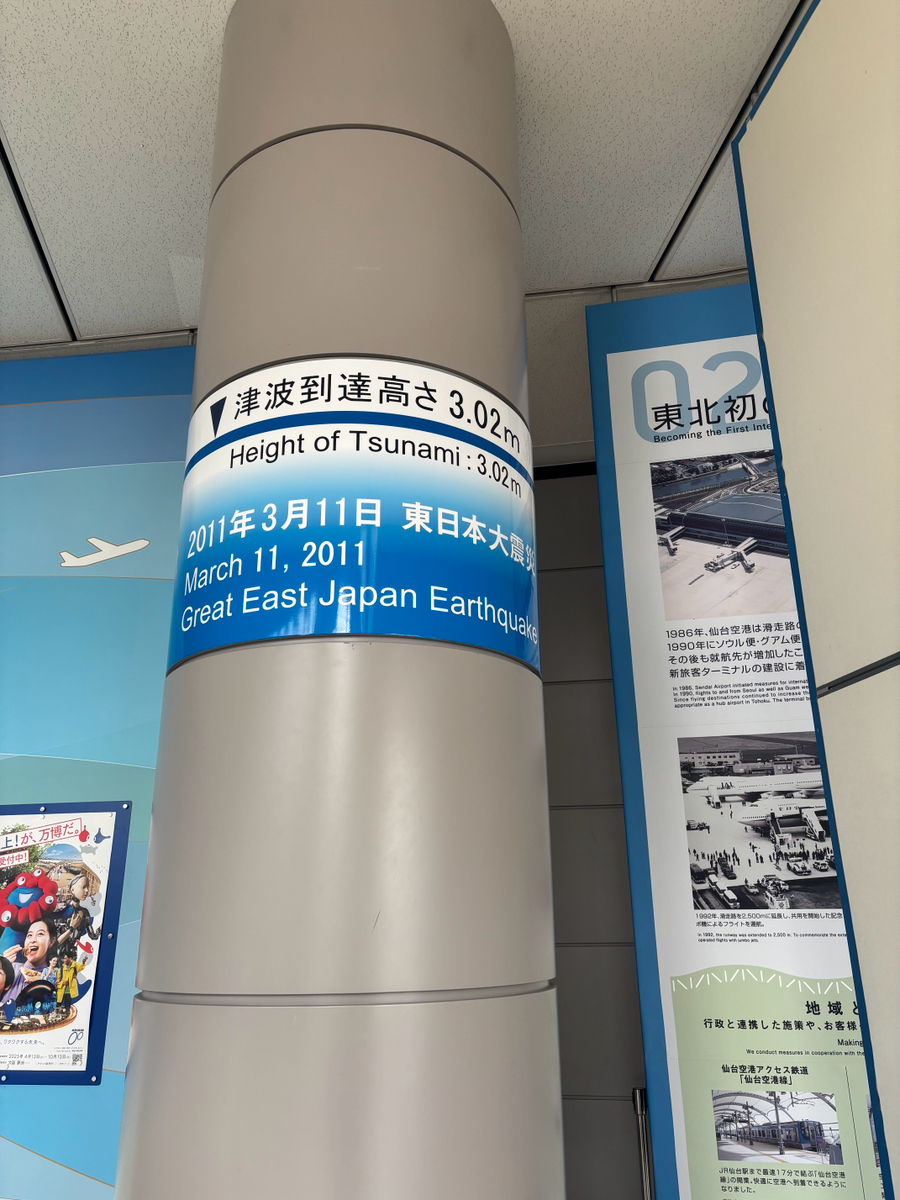 2011年3月11日に起きた東日本大震災では海の近くにある仙台空港も津波の被害に遭いました。 その悲惨さや仙台空港の歴史を到着ロビーで見ることが出来ます。