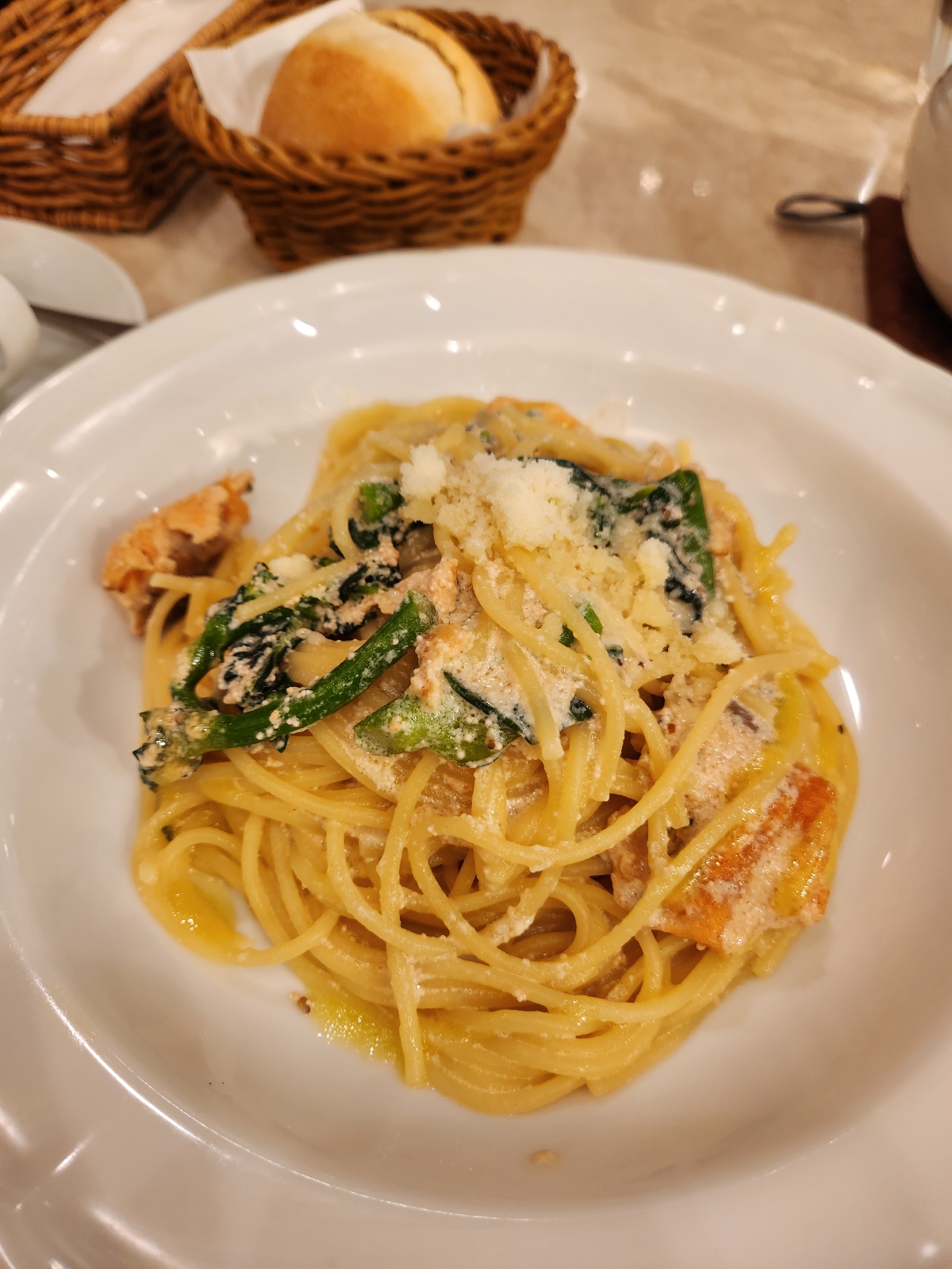 ストロベリーチャイ 明太子とサーモンのクリームソースパスタ