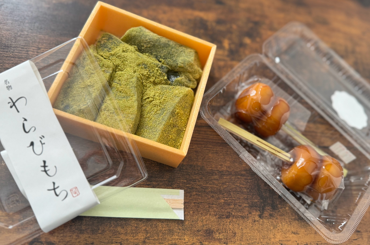 総社駅から歩いて7分くらい。 テイクアウト専門店で、わらび餅とみたらし団子を購入。 きな粉がたっぷりかかった、口どけのいいわらび餅と、甘辛いタレが絡んだみたらし団子おいしかった❕