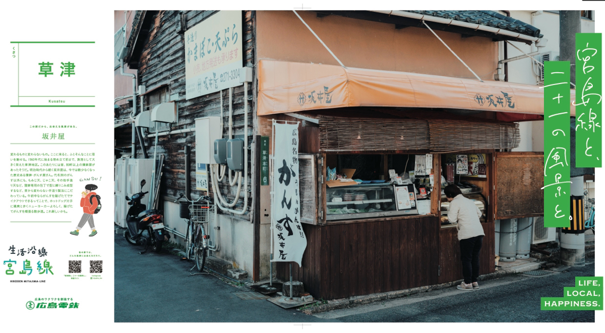 生活沿線 宮島線 広島電鉄の宮島線全駅がポスター展会場に。 広電西広島駅から広電宮島口駅までの21駅を会場に、1駅1枚、全21種類の「この駅で出会える風景」ポスターを期間限定展示中です。 いざ、各駅を巡る展覧会へお越しください。