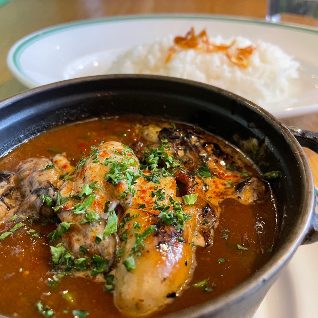 仲通りの商店街を抜けた先にある人気のカレー屋さん。今日は冬季限定の牡蠣と春菊のカレーをいただきます。