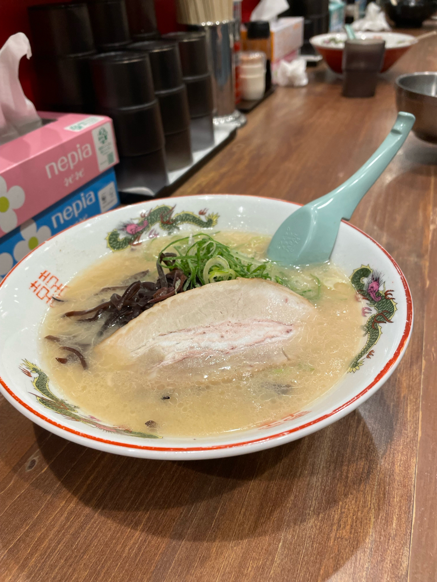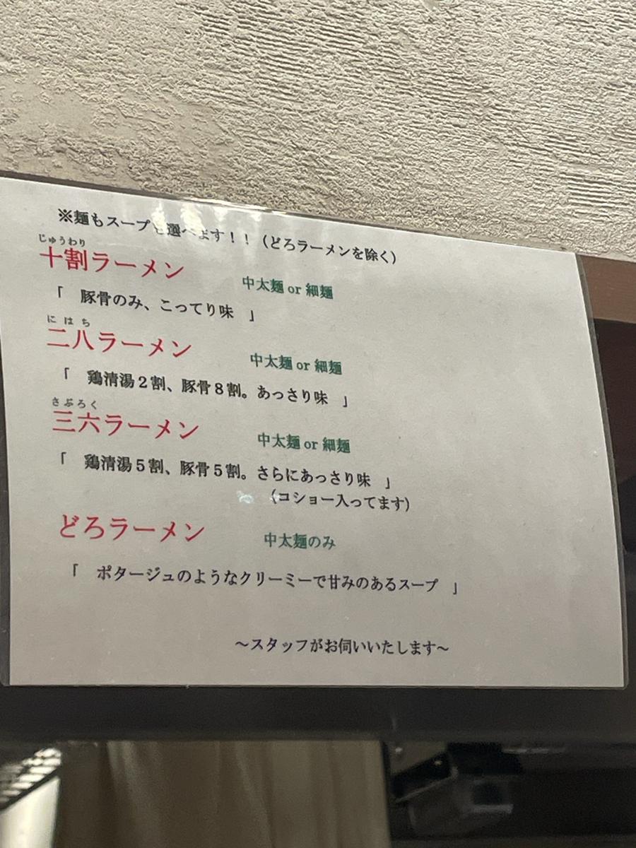 豚骨ラーメン、十割(豚骨のみ、こってり味)、細麺、普通を注文しました。