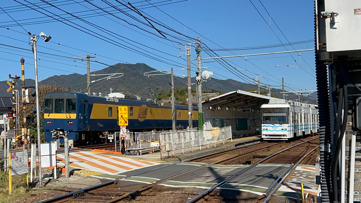 地御前駅で撮影中にJR西日本DEC741形総合検測車に遭遇。なかなかみられない車両とのツーショットでしばらく興奮がおさまりませんでした。