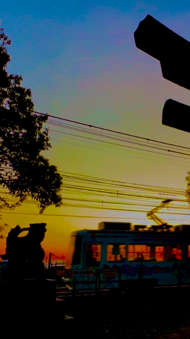 朝焼け、神社、そしてひろでん