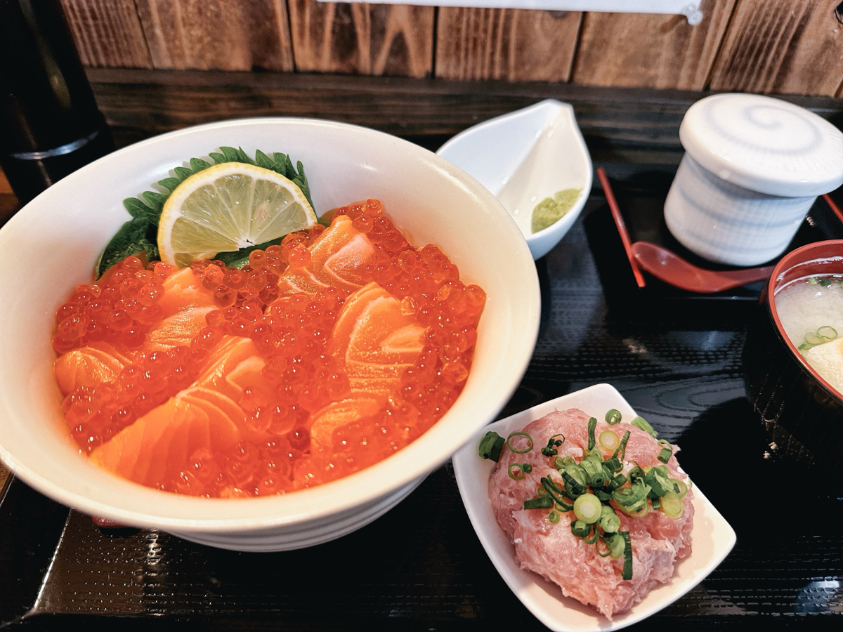 吉井の白壁通りに海鮮丼の人気店 色々な丼があり迷ってしまいます 私は海鮮親子丼♪サーモンといくらです ネギトロもトッピングしました おすすめ♪ NC:早坂