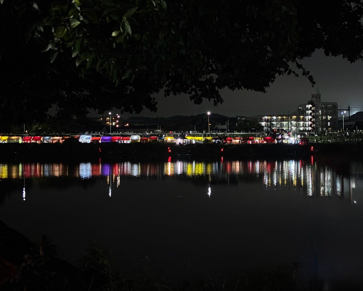 調布花火大会会場から対岸に見える景色です。色とりどりの屋台の灯りが水面に映る様は、なんとも幻想的です。