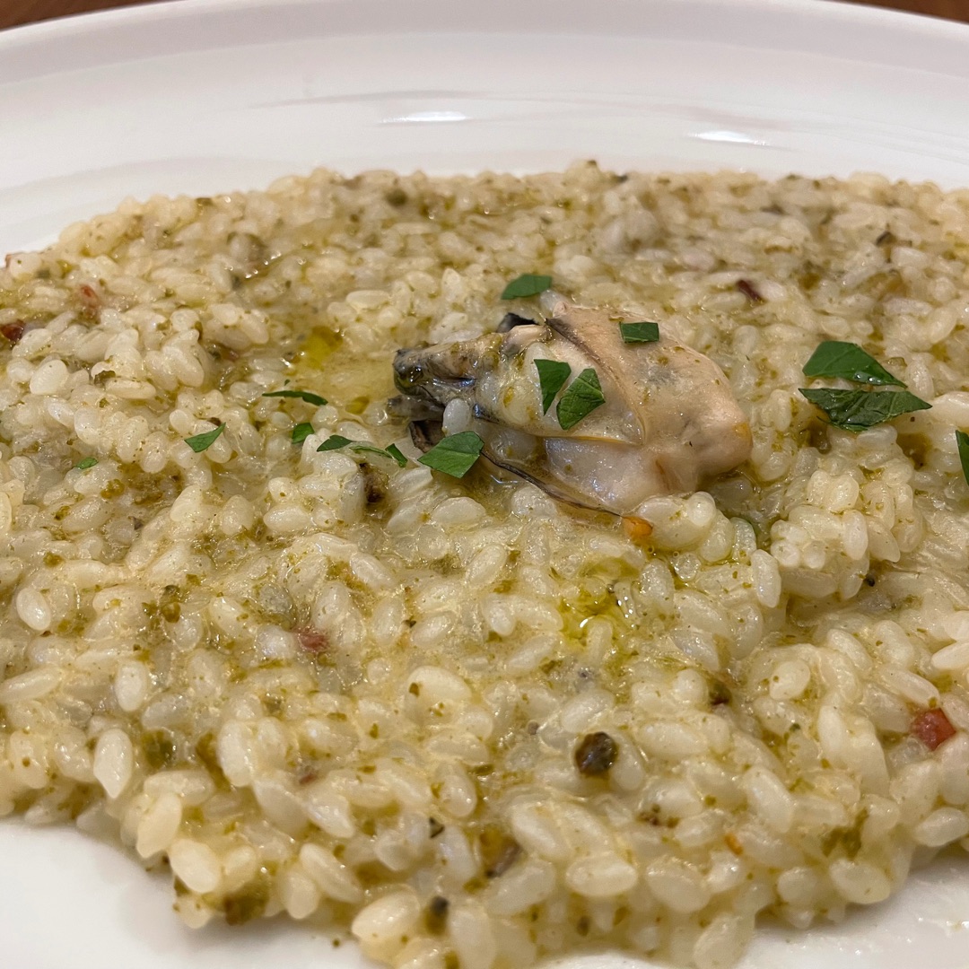 選べるパスタorリゾットは「牡蠣のリゾット(+300円)」にしました。自家製フォカッチャと前菜とサラダの盛り合わせが付いてます。